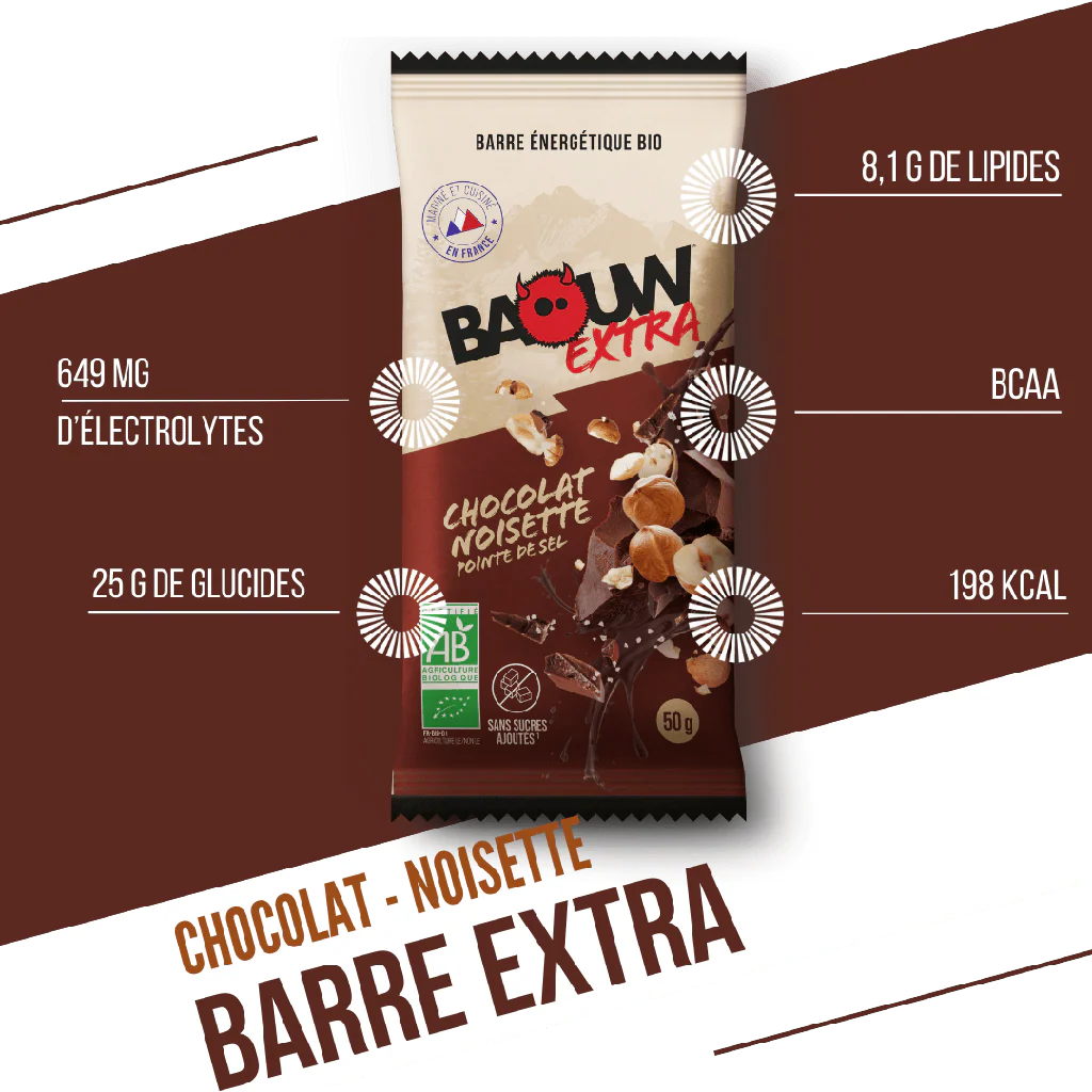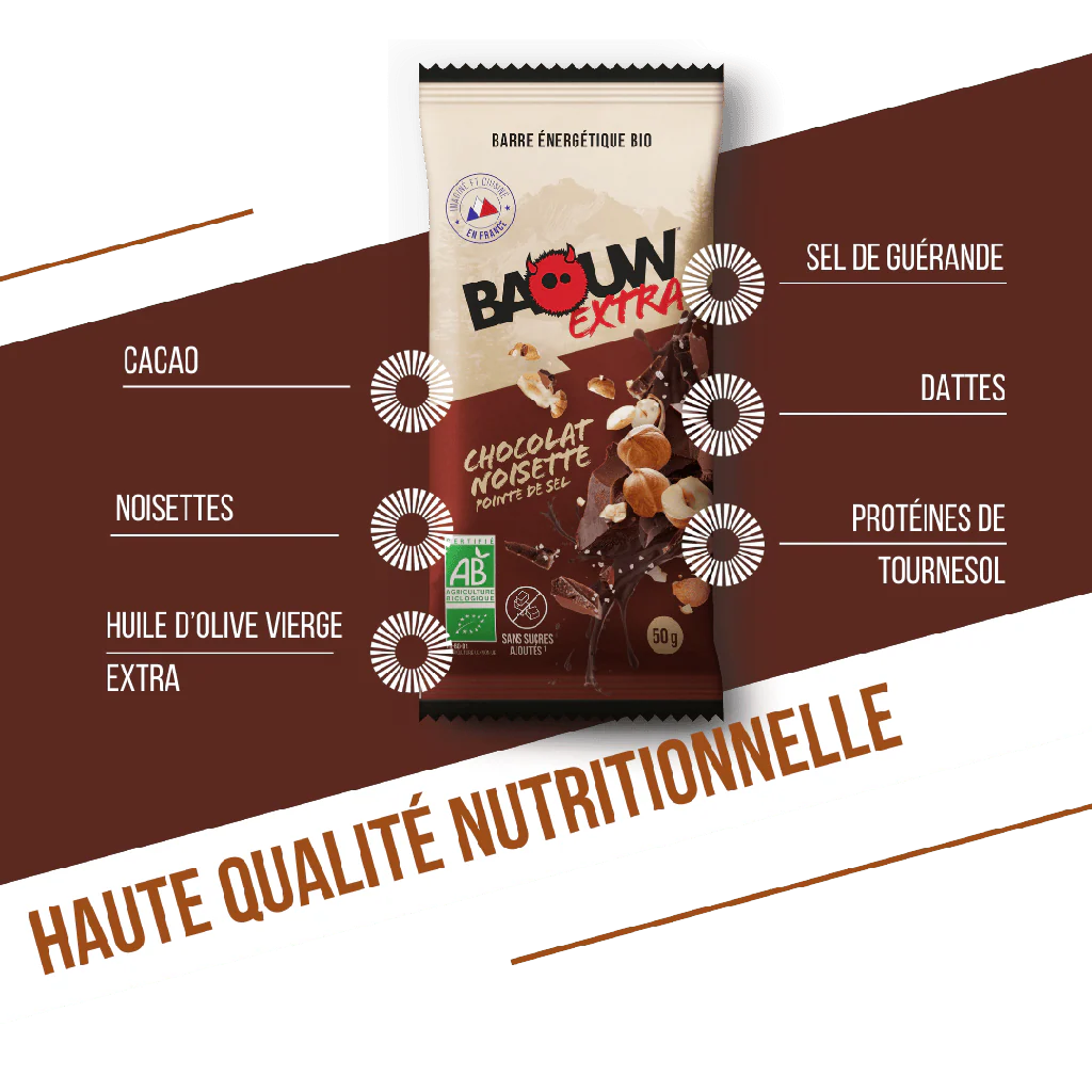 La barre énergétique Baouw Chocolat & Noisette allie plaisir et performance avec son goût intense de chocolat et la douceur des noisettes. Conçue pour offrir une énergie progressive et naturelle, elle est idéale avant, pendant ou après l’effort, tout en garantissant une digestion optimale.