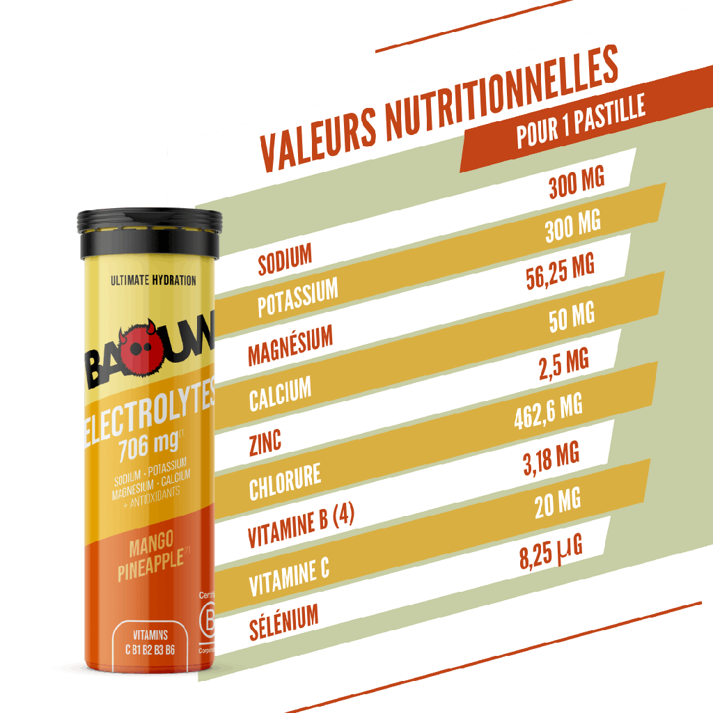 Concentration élevée : 706 mg d’électrolytes par pastille, soit +60 % par rapport à la moyenne des concurrents.