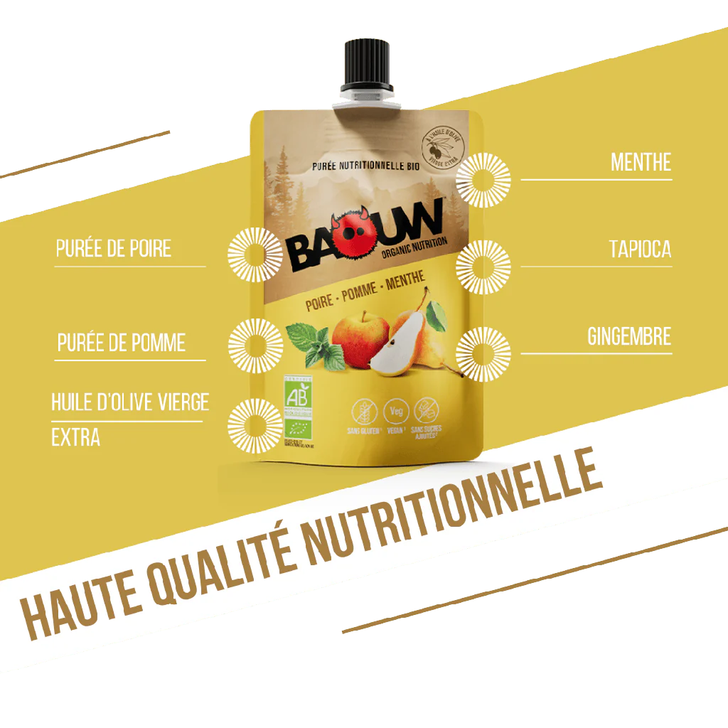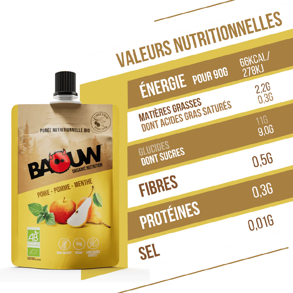 La purée énergétique Baouw Poire, Pomme & Menthe offre une énergie naturelle et rafraîchissante pour accompagner vos efforts. Son association fruitée et sa touche de menthe en font un encas digeste et désaltérant, idéal pour les longues sorties ou en récupération.