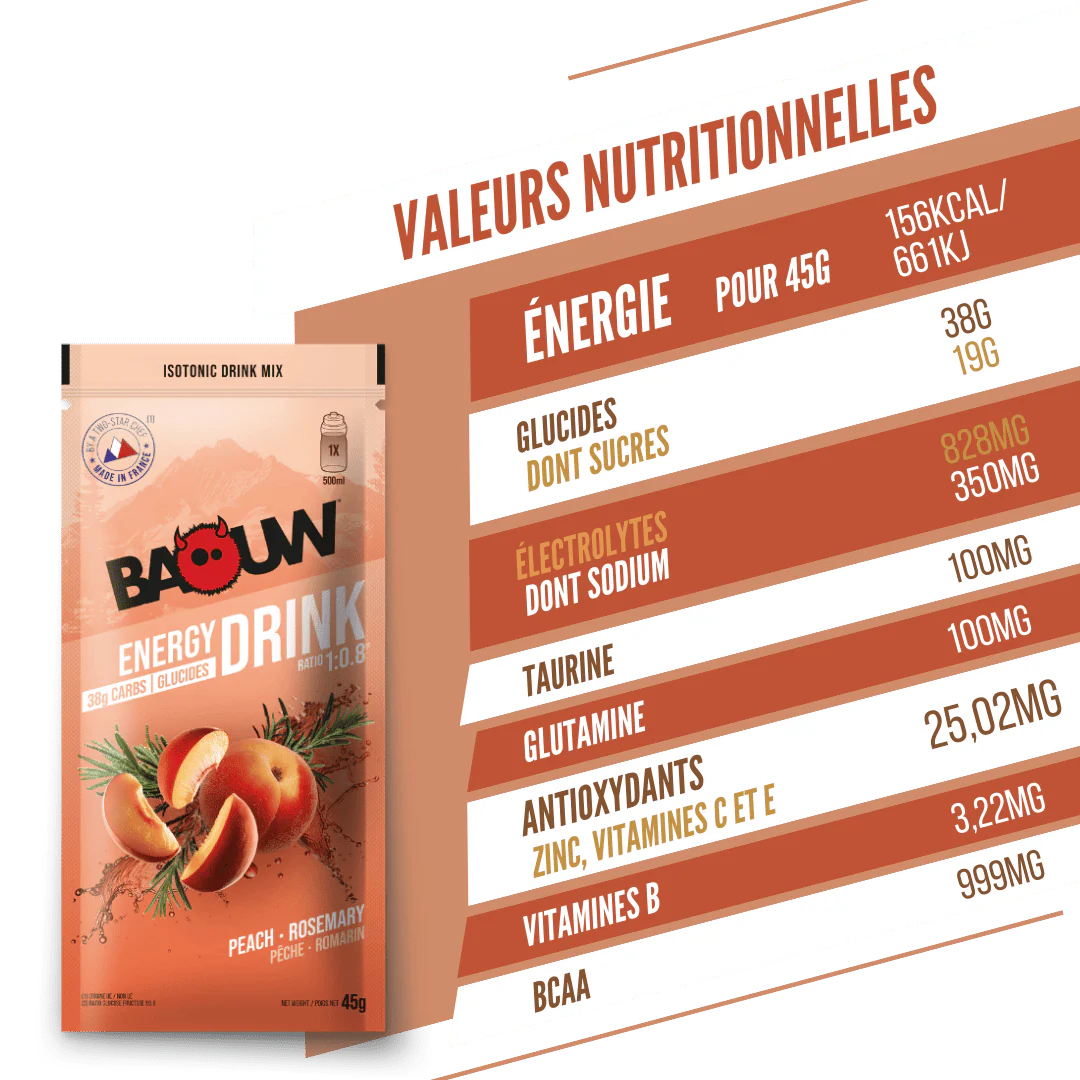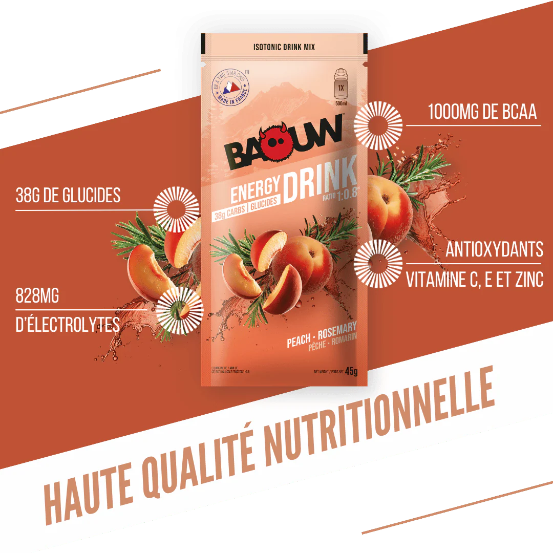 La boisson énergétique bio Pêche / Romarin Baouw est un mélange naturel en poudre conçu pour soutenir les efforts d’endurance. Formulée à partir d’ingrédients issus de l’agriculture biologique, elle fournit une énergie progressive tout en favorisant une hydratation optimale pendant l’activité.