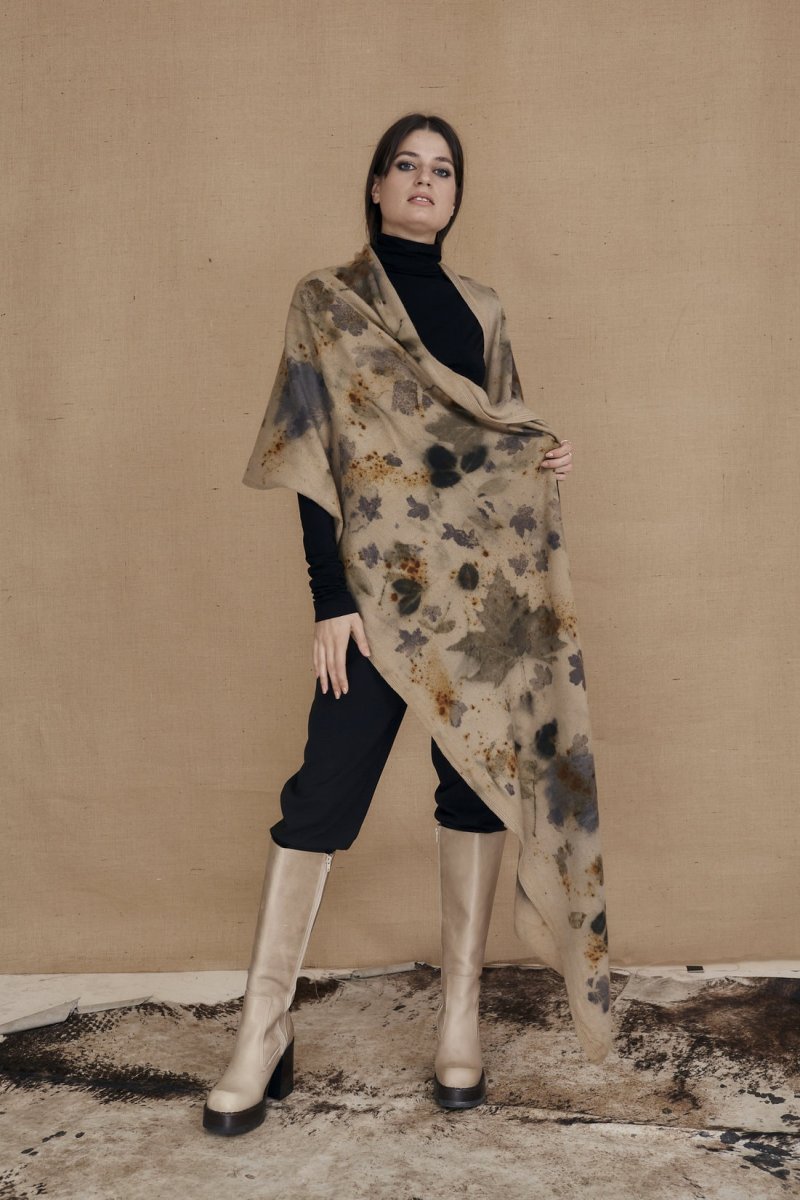 Beige large printed wool shawl VIRTUO. Wrap yourself in nature with Eco-Print!