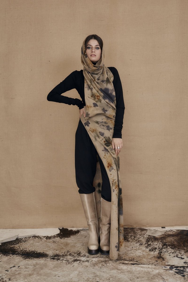 Beige large printed wool shawl VIRTUO. Wrap yourself in nature with Eco-Print! Play with your imagination with this modular shawl from the ASKA collection. For the autumn-winter season, the shawl is back with an original and unique cut. It can be worn as a cardigan: you just need to slip it on like a sleeve, […]