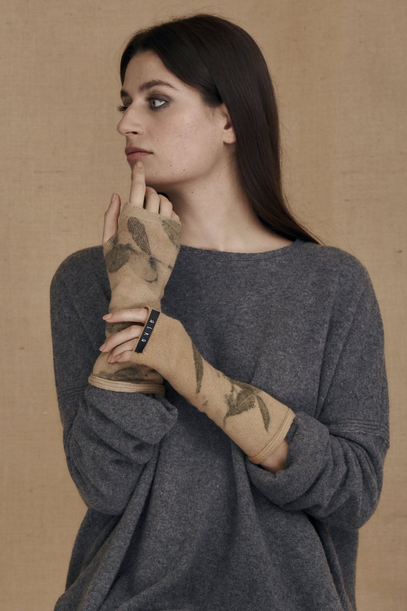 Beige printed wool mittens for women FLORA