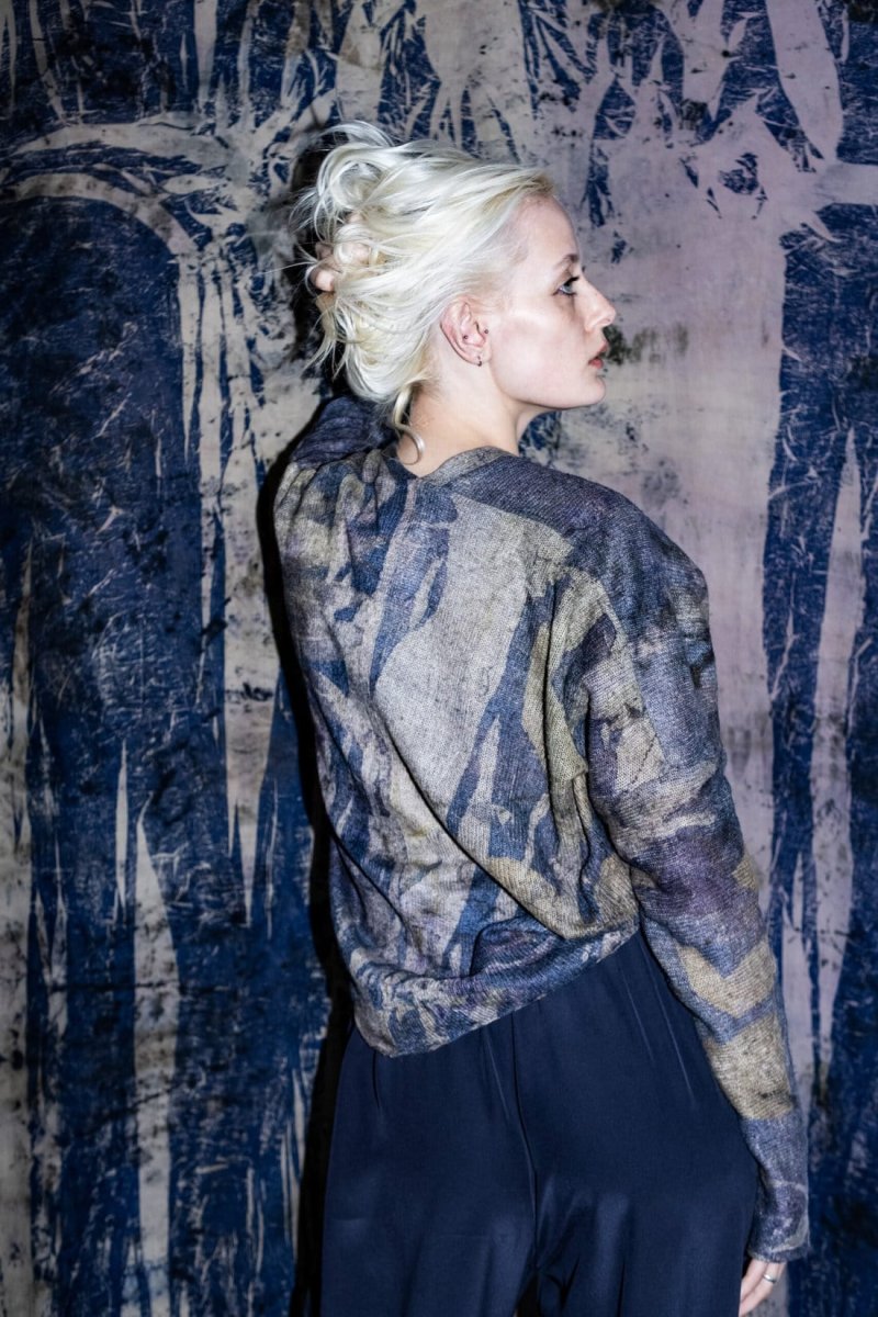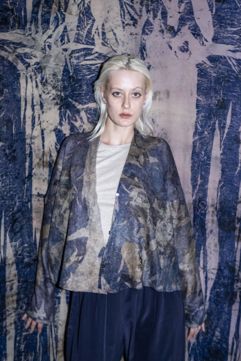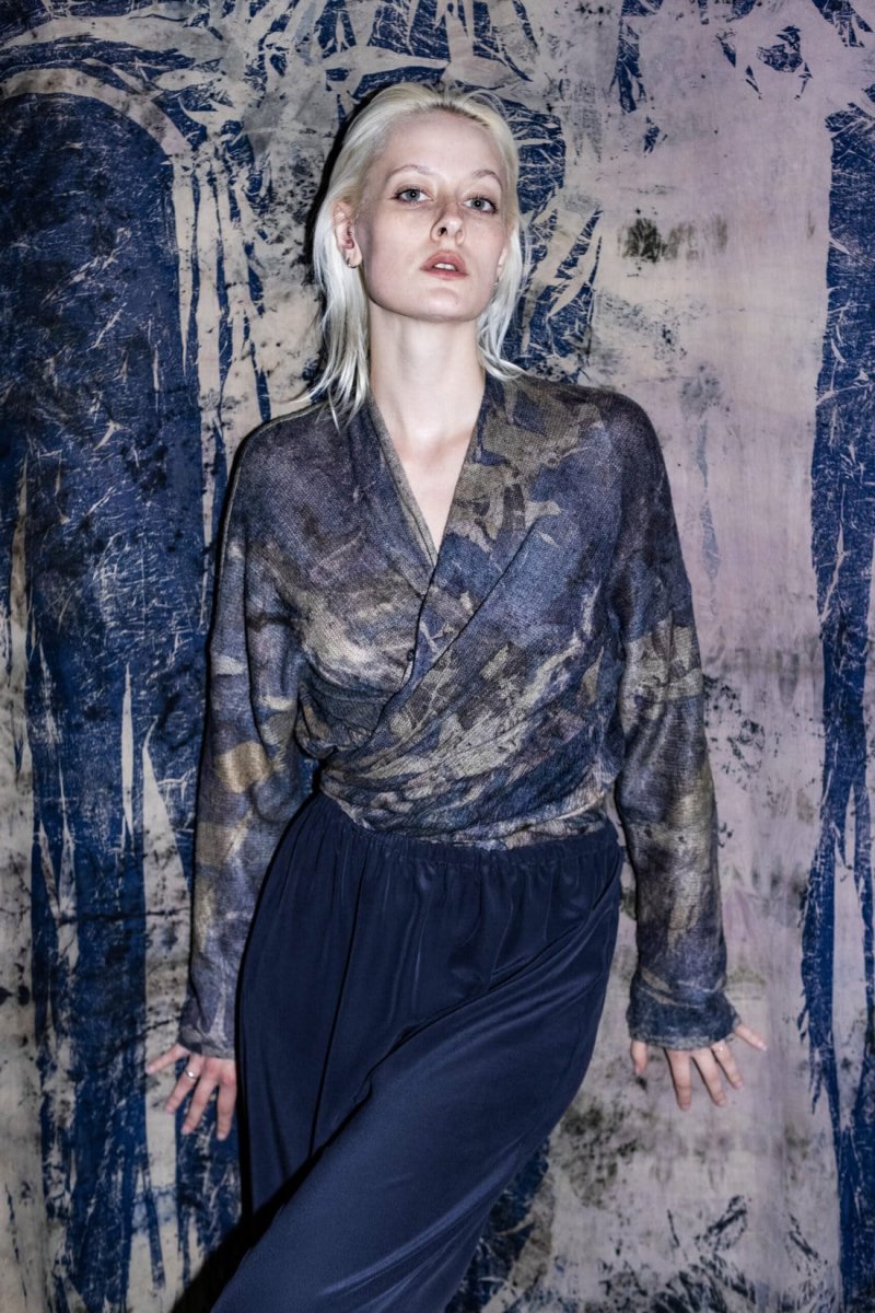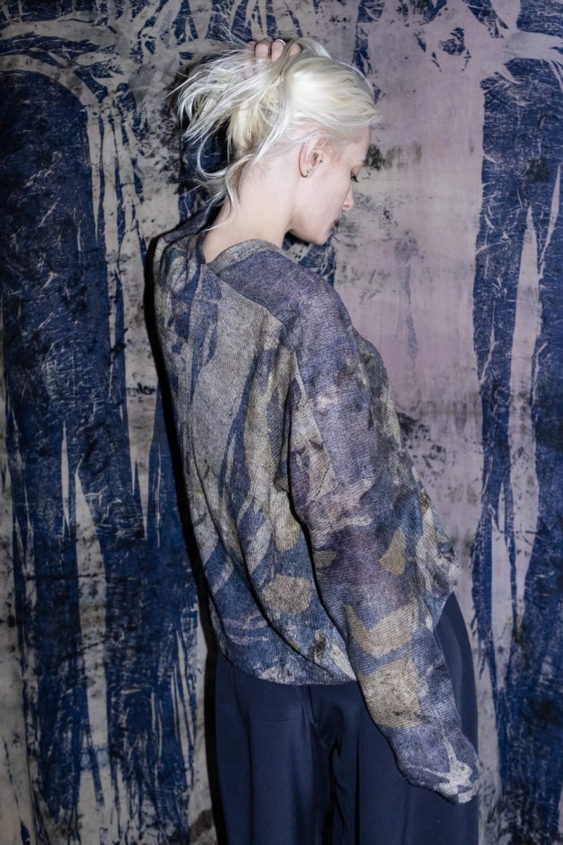 La douceur et le luxe du cachemire du Népal orné d’un imprimé eco-print unique, aux teintes végétales et marines. Cette pièce ultra-féminine, se porte aussi en cache-cœur.