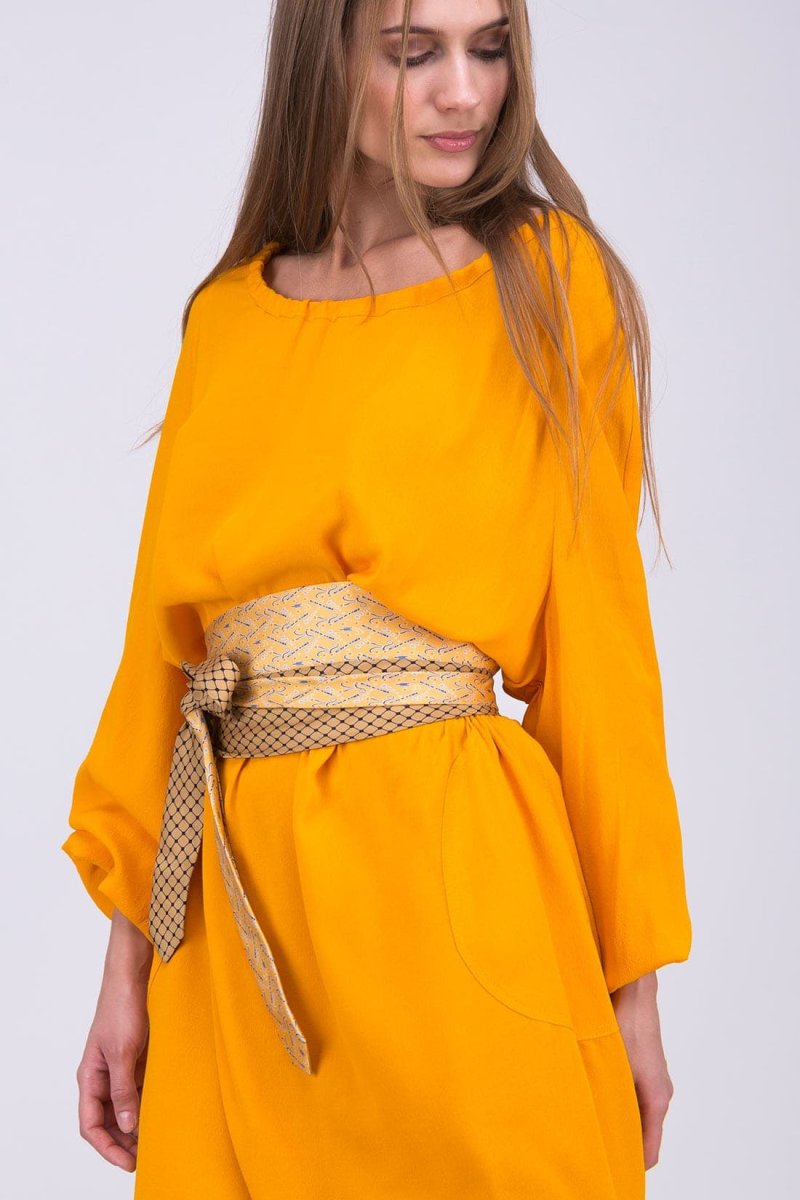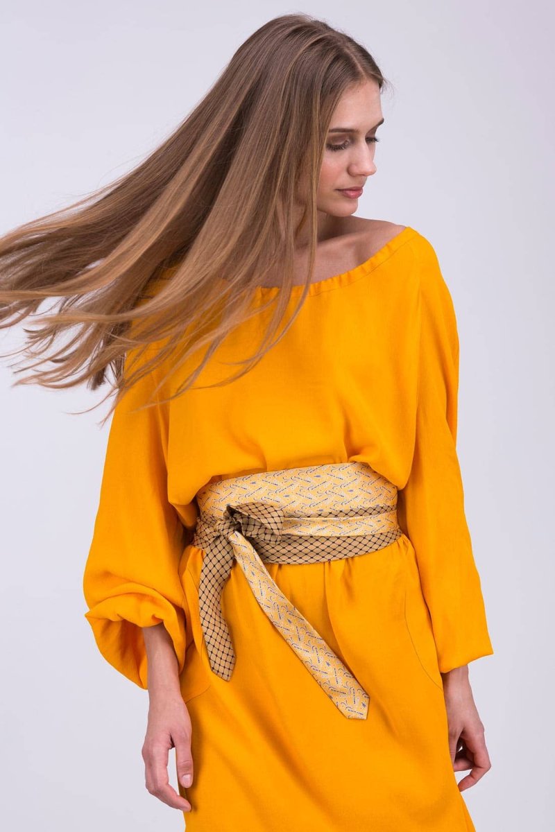 Ceinture en tissu jaune et beige pour femme OBI-16. Cette saison, optez pour la ceinture-cravate !