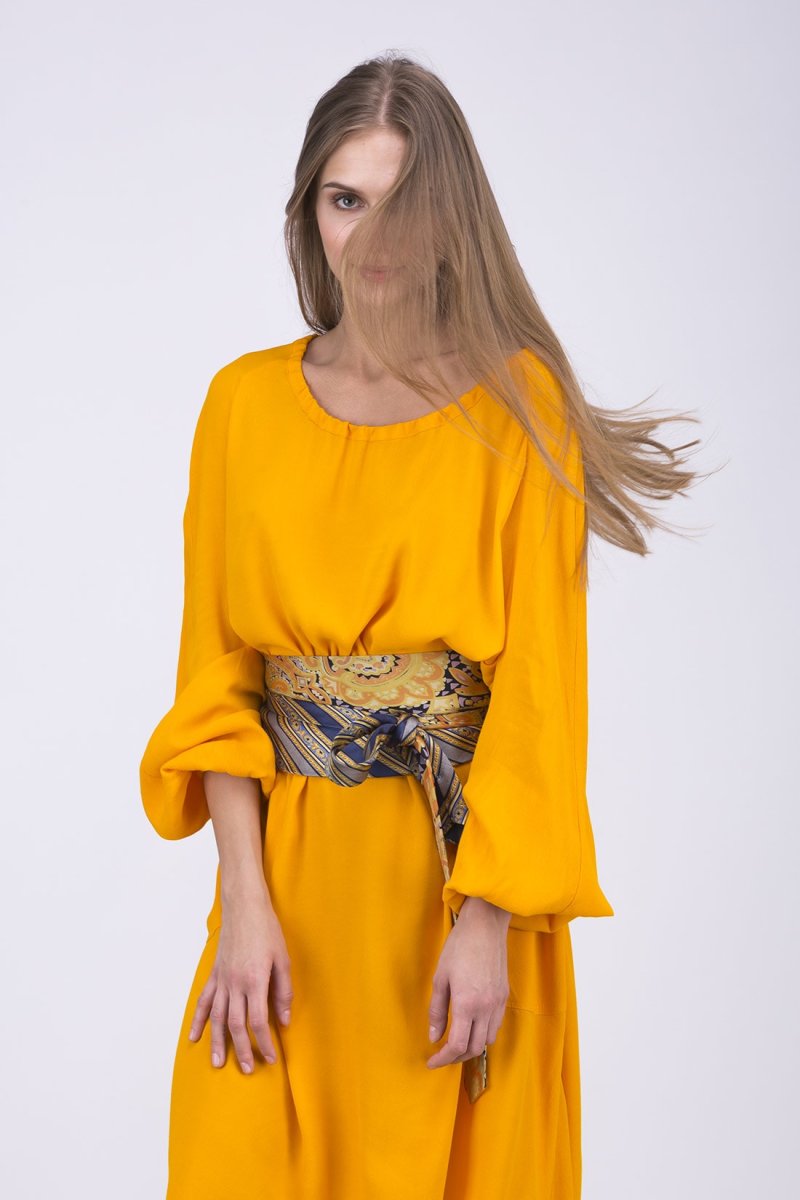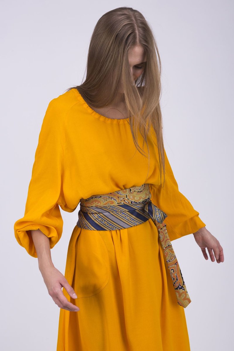Ceinture en tissu jaune et bleu pour femme OBI-22. Cette saison, optez pour la ceinture-cravate !
