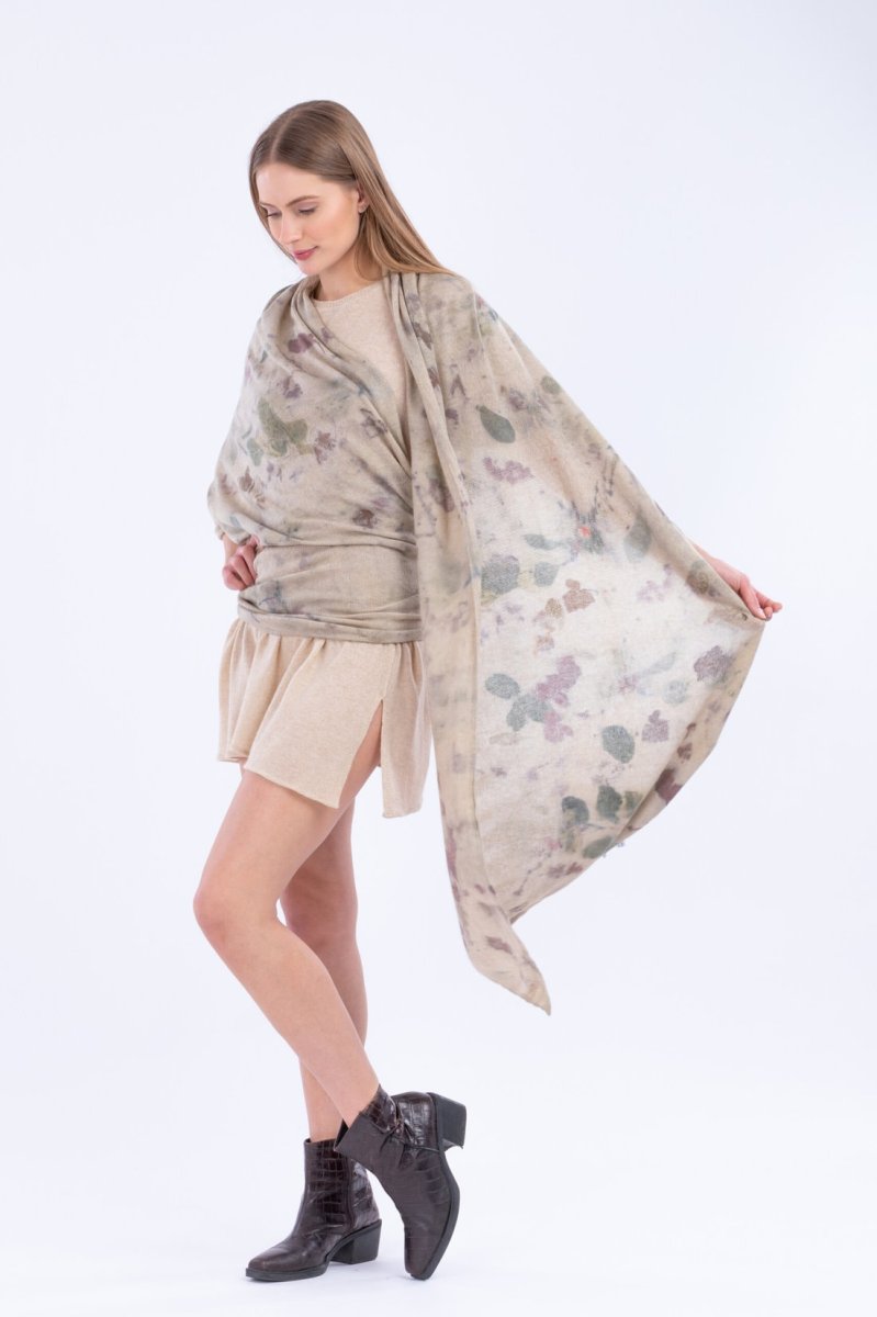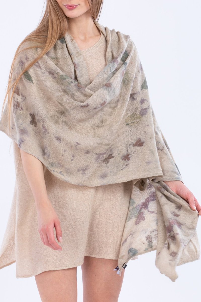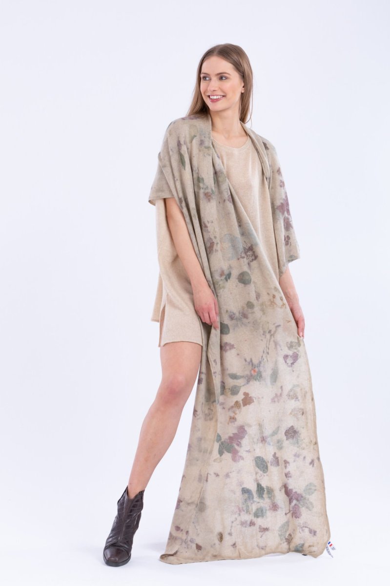 La douceur et le luxe du cachemire de Mongolie, orné d’un imprimé eco-print unique. Vrai cocon modulable, ce grand châle écru peut se porter de multiples façons, au gré de votre imagination ! Cette pièce luxueuse peut même se transformer en gilet simplement en s’enfilant comme une manche.