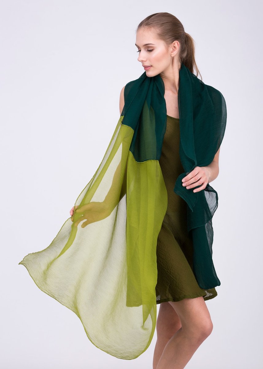 Châle tunique bleu vert en soie OWOW. Toujours utile ! Ce châle bicolore léger et 100% soie saura accompagner vos tenues d’été et intégrera désormais vos accessoires fétiches ! Composition : 100% soie Lavage : Nettoyage à sec Taille : UNIQUE
