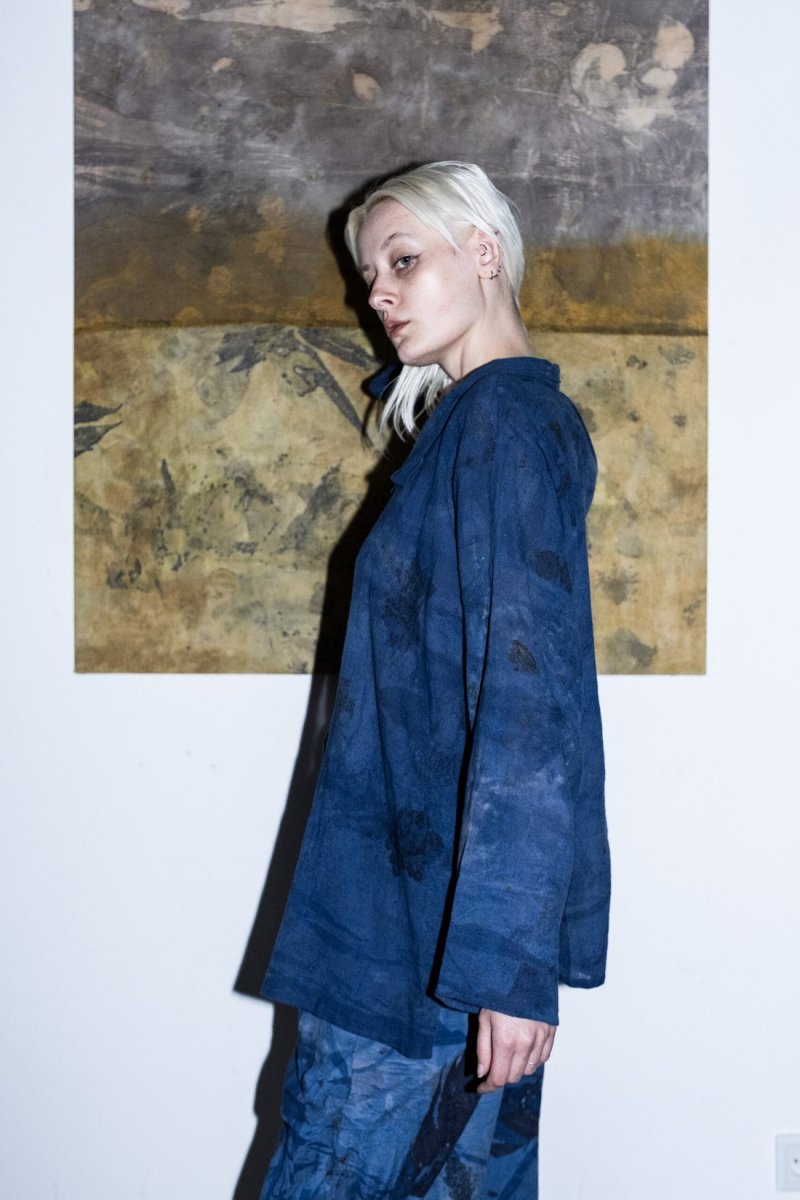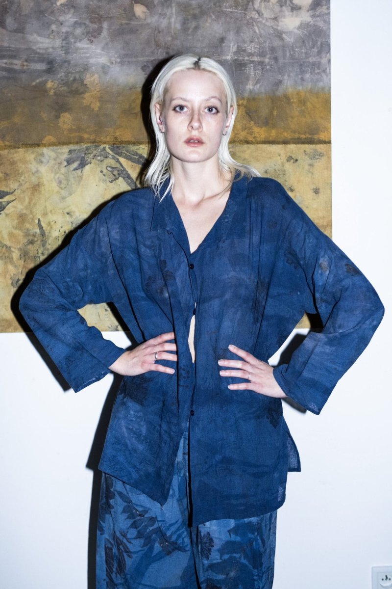 Chemise bleue ample pour femme en coton bio imprimée ABI. L’impression écologique à l’honneur !