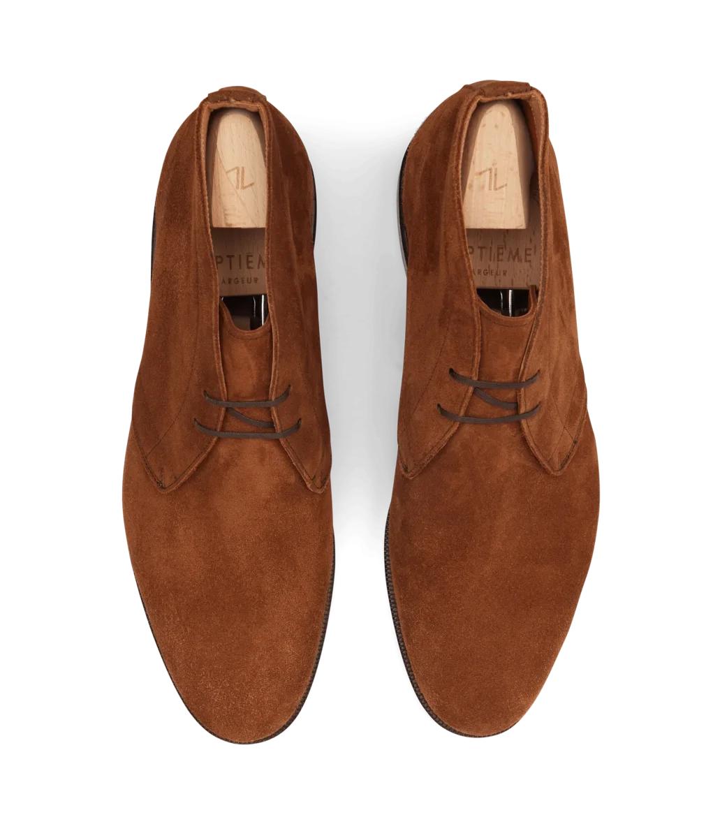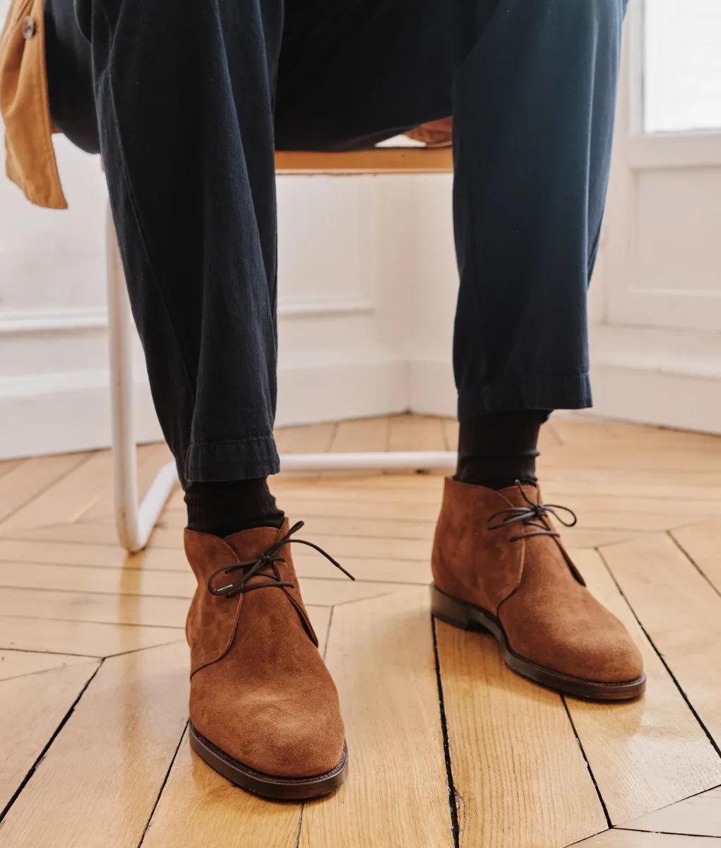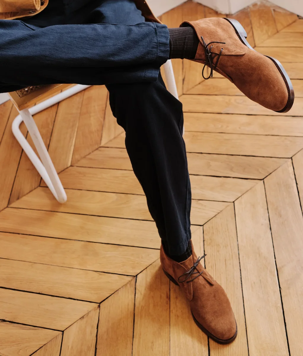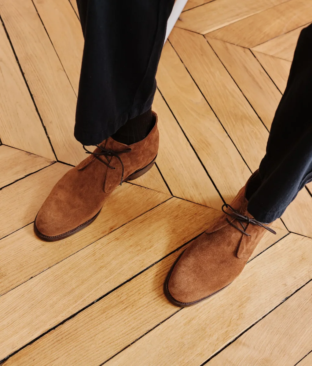 Incontournable et intemporelle, la desert boots ou Chukka revient ici dans une version estivale accompagné d’une double semelle cuir.