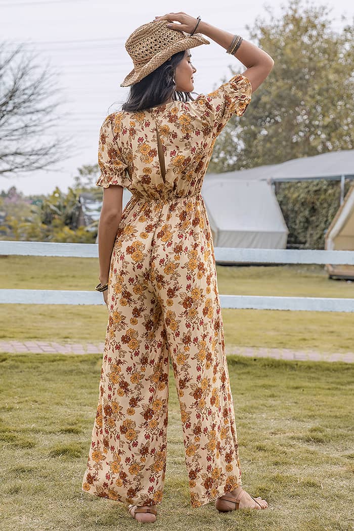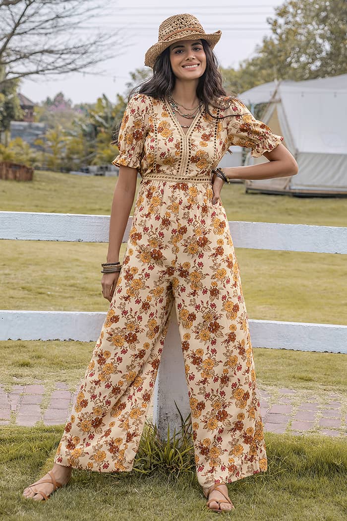 Pour adopter un look bohème réussi, cette combinaison mise sur un imprimé fleuri qui apporte du caractère à la tenue. La coupe fluide et ample du pantalon contribue également à créer ce look boho chic adorable.