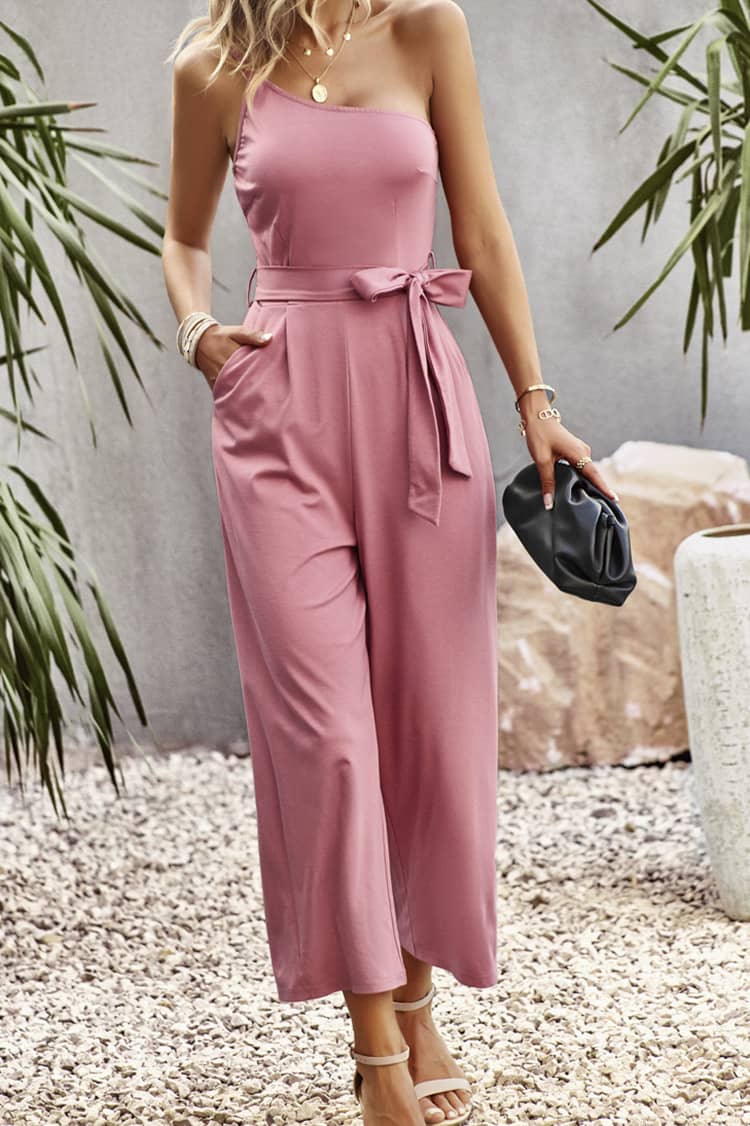 En plus de sa couleur unie, cette combinaison chic propose une taille haute ceinturée qui donne à votre silhouette un style plus travaillé. Son encolure asymétrique souligne également le buste avec élégance et féminité.