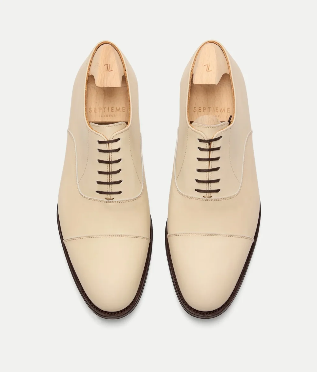 Un grand classique réinterprété par Septième Largeur : le richelieu à bout droit sur une forme ronde, pour un style élégant et intemporel.
