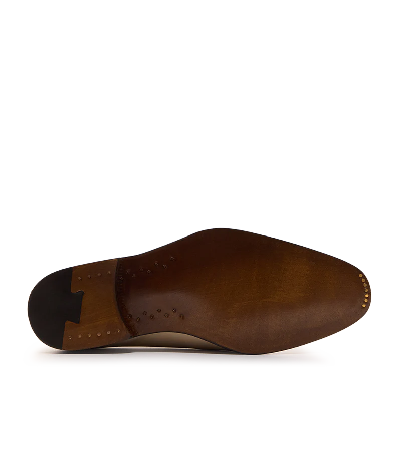 Une couture main doubles aiguilles qui joint les deux empiècements et une autre pincée, inversée sur le bout dur, en toute discrétion à l’avant de la chaussure. Vous aurez le plaisir de voir se révéler cette dernière au fil de l’usure et la patine du temps sur votre soulier
