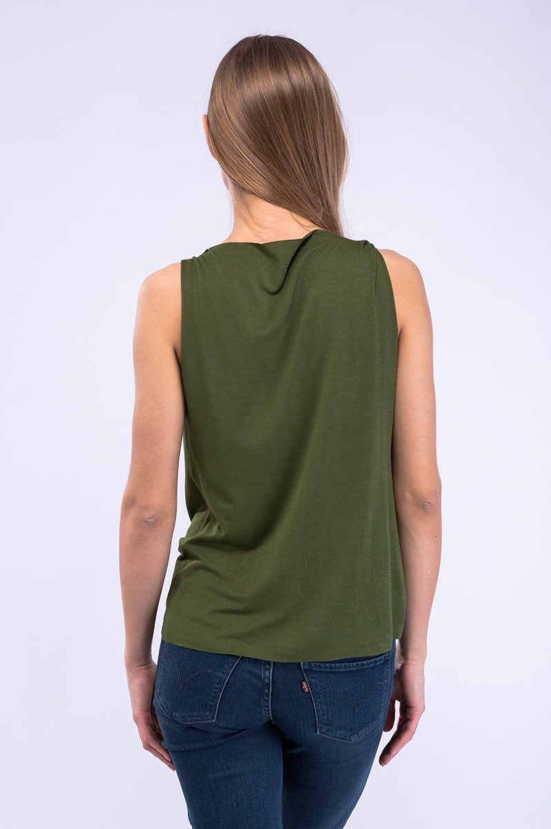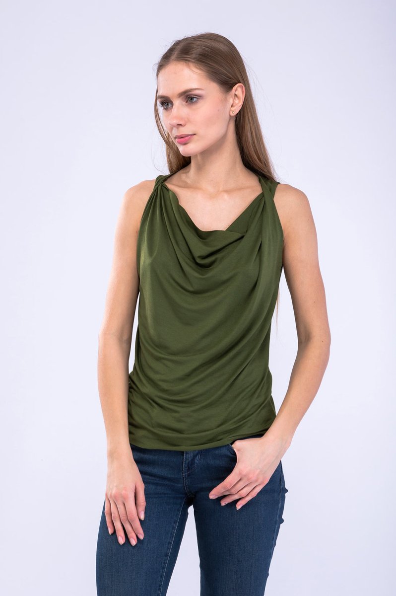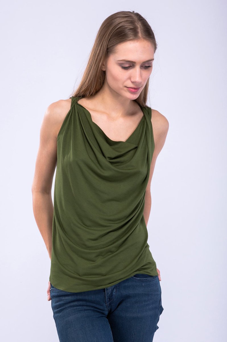 Green draped cowl neck viscose jersey top for women PARISA. Flowing, in an easy to wear viscose mesh.