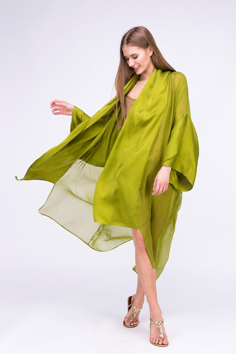 Green silk kimono dress WEZEN. Elegance and refinement. Enhance your wardrobe with this favorite piece! A pistachio-colored long, silk chiffon dress with silk satin sleeves and neckline. It can be draped to your liking, either loose-fitting or cinched with a fine belt. Composition : 100% silk Washing : Cold wash separately One size fits all