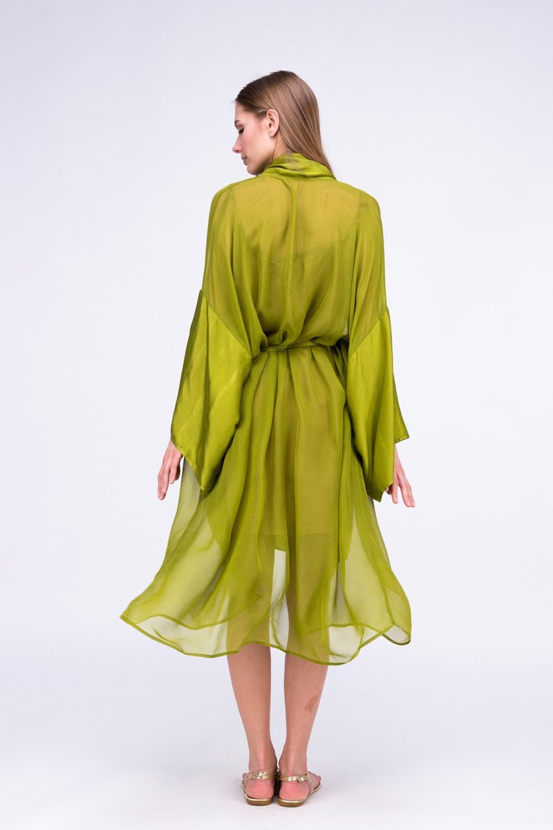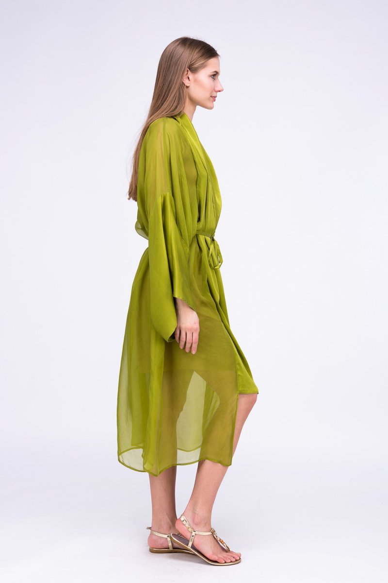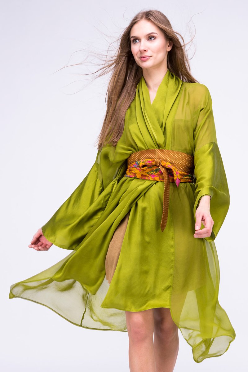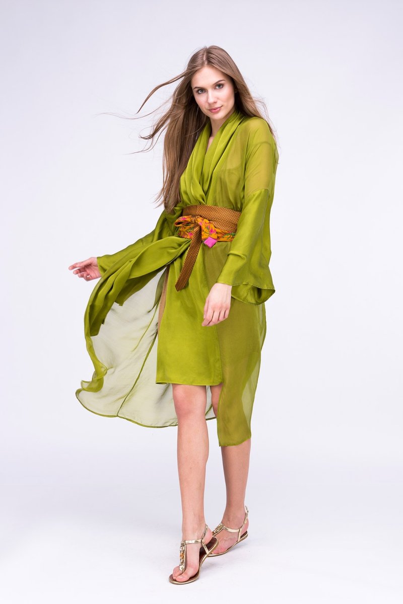 Green silk kimono dress WEZEN. Elegance and refinement.