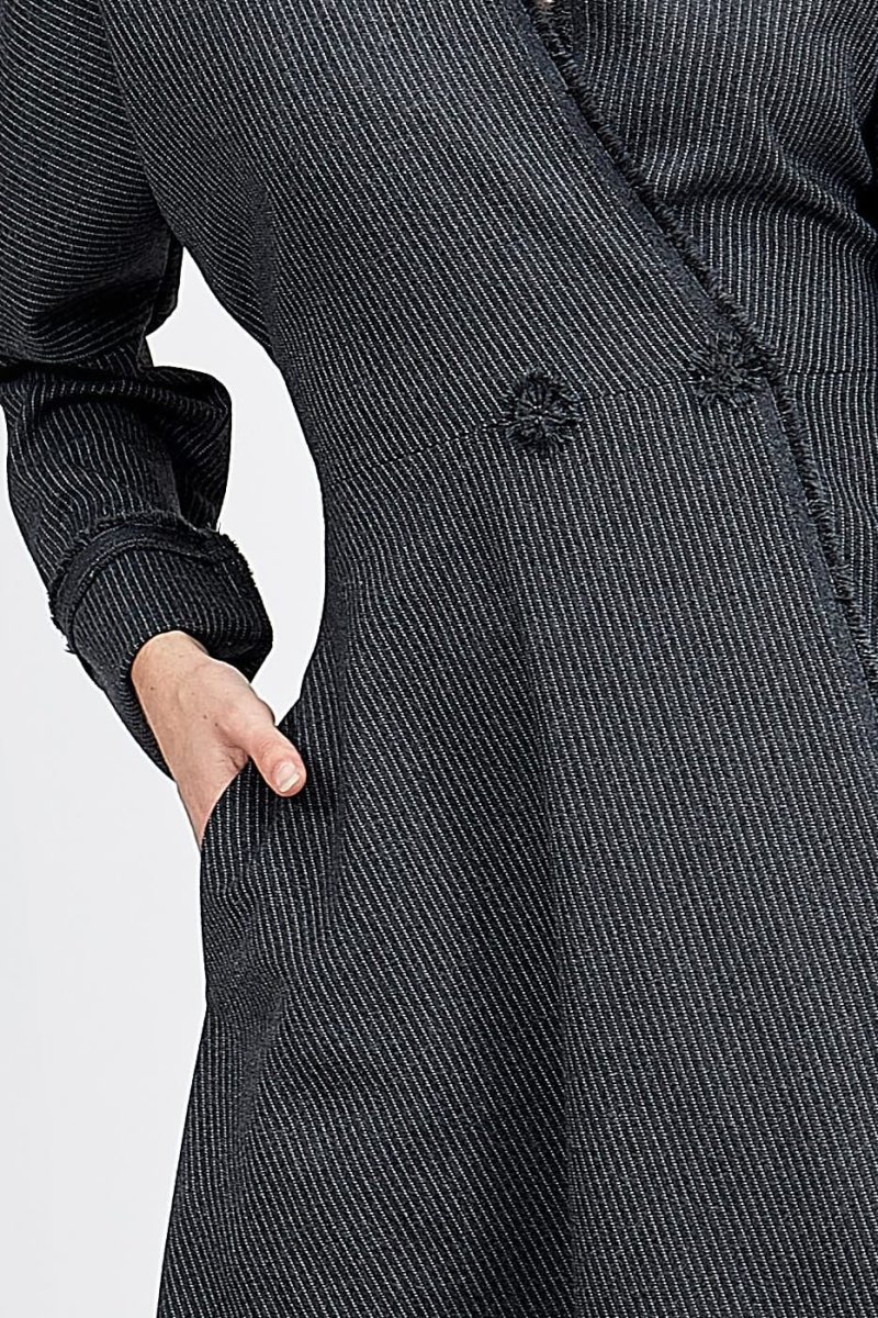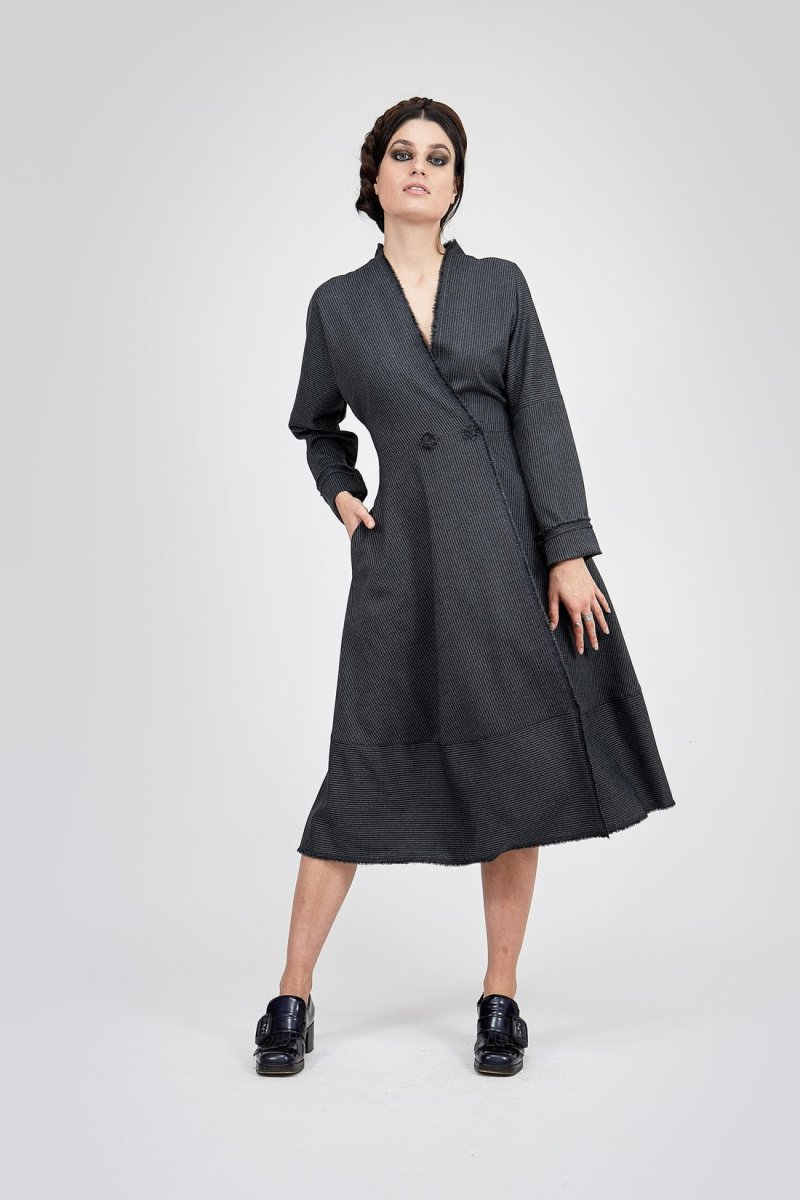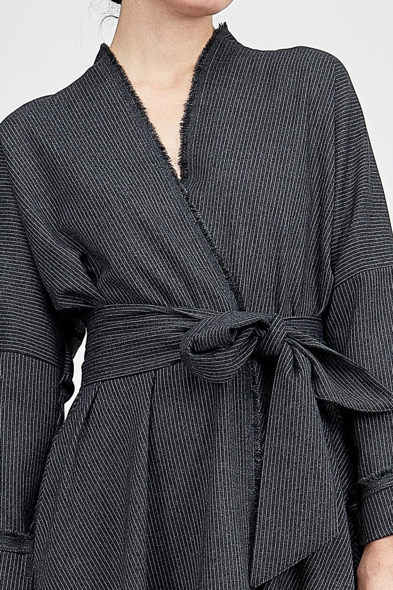 Timeless, with a shawl collar, highlighted at the waist by a long belt, which you can tie at will or simply close with two buttons handmade by Aska. Can be worn cinched, as a dress, or open, like a coat. The small fringes that finish the edges of the dress and the play of stripes add an original and feminine side to this masculine fabric.