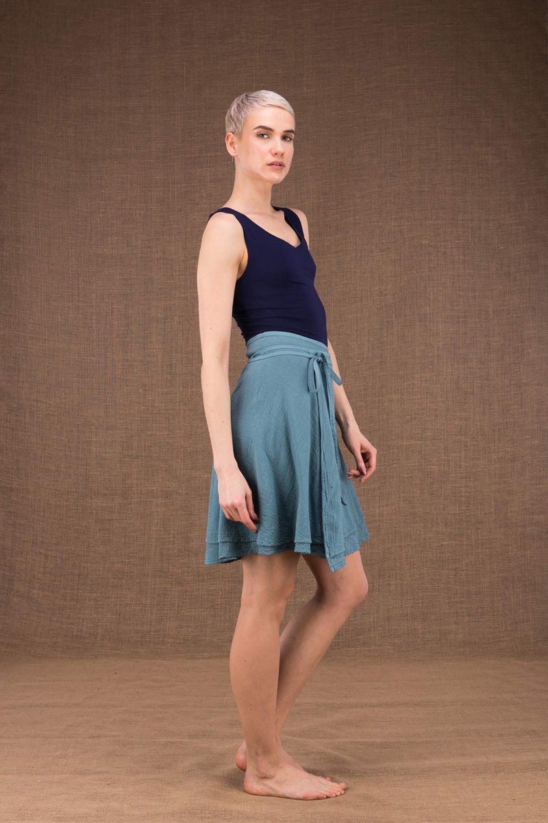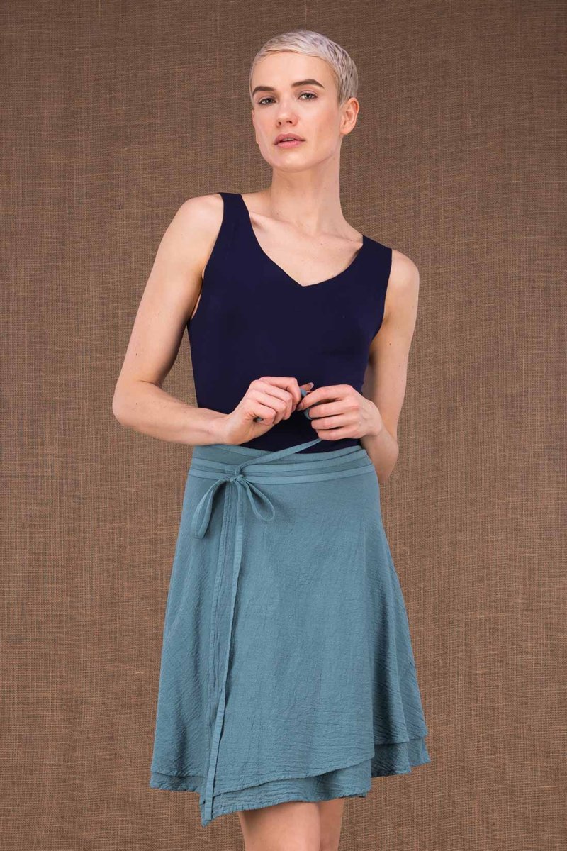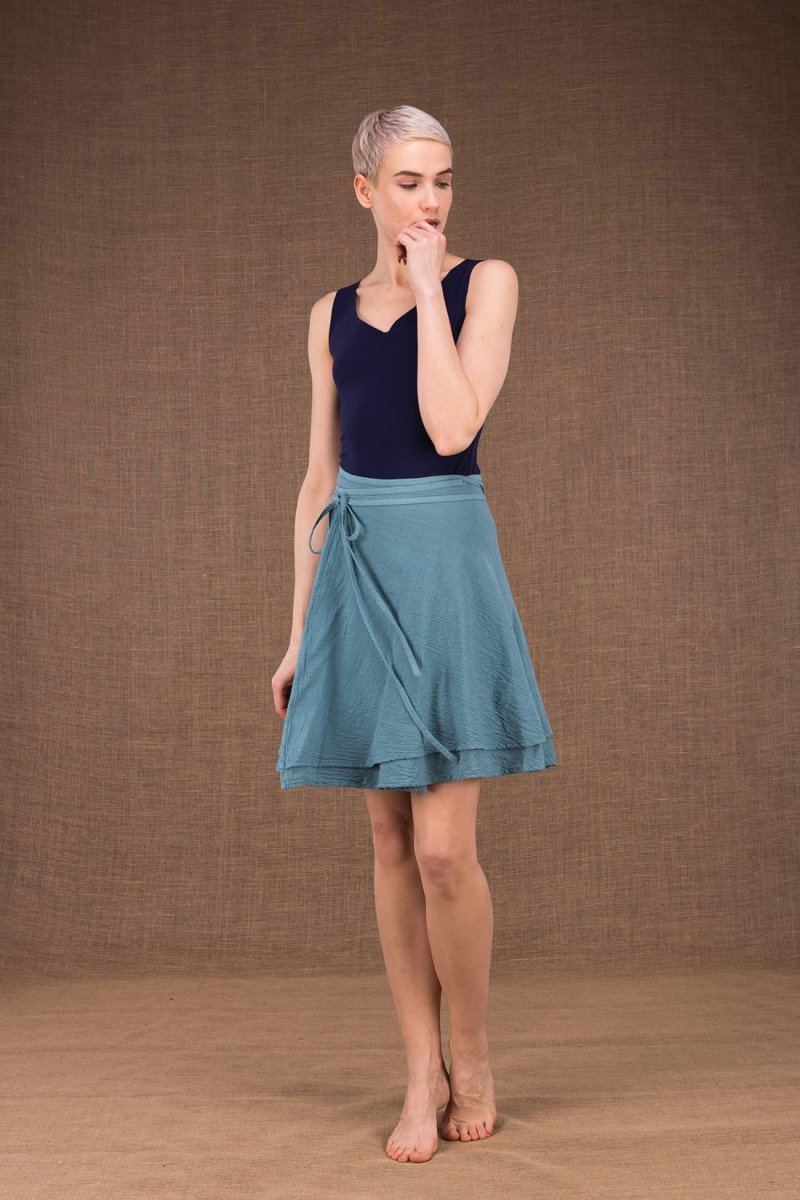Jupe portefeuille bleue courte évasée en coton bio ARIA. L’esprit plage, avec cette jupe courte portefeuille, évasée et dansante en coton crépon qui sublimera votre silhouette.