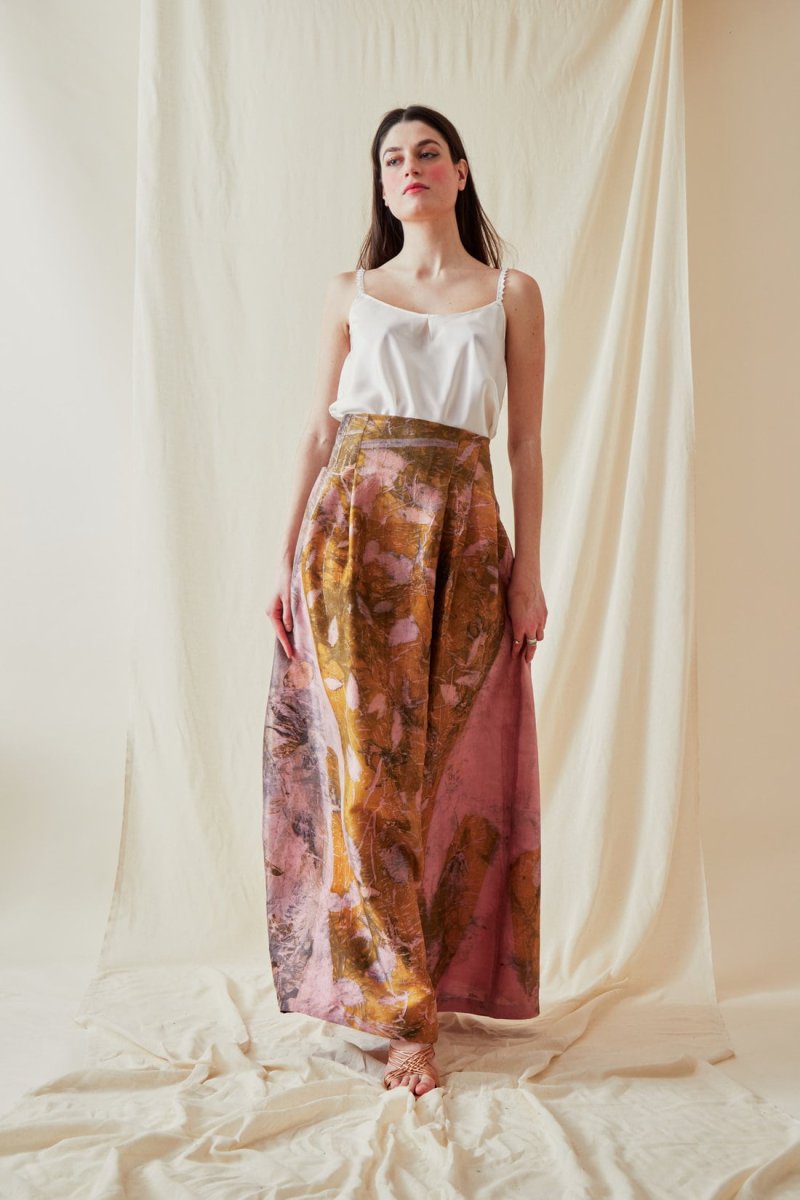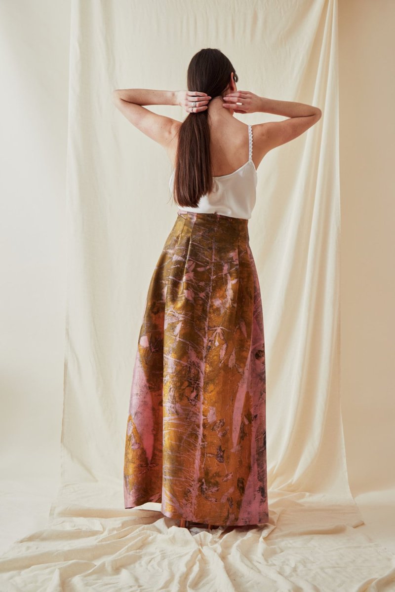 La touche ASKA : une étonnante alliance de couleurs – jaune bouton d’or, ocre, gris argent, kaki et rose pâle – semées de fines feuilles d’acacia et d’érable du Japon. Jupe ample de forme classique, imprimée eco-print avec pinces à la taille descendant sur les hanches, qui vous met en valeur dans toutes les circonstances. Peut se porter taille haute ou basse.