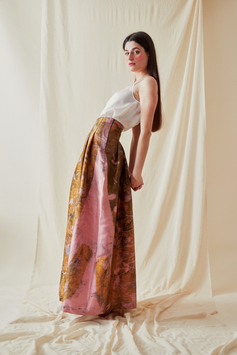 Jupe rose jaune longue en soie sauvage imprimée SARIA, un tableau végétal.