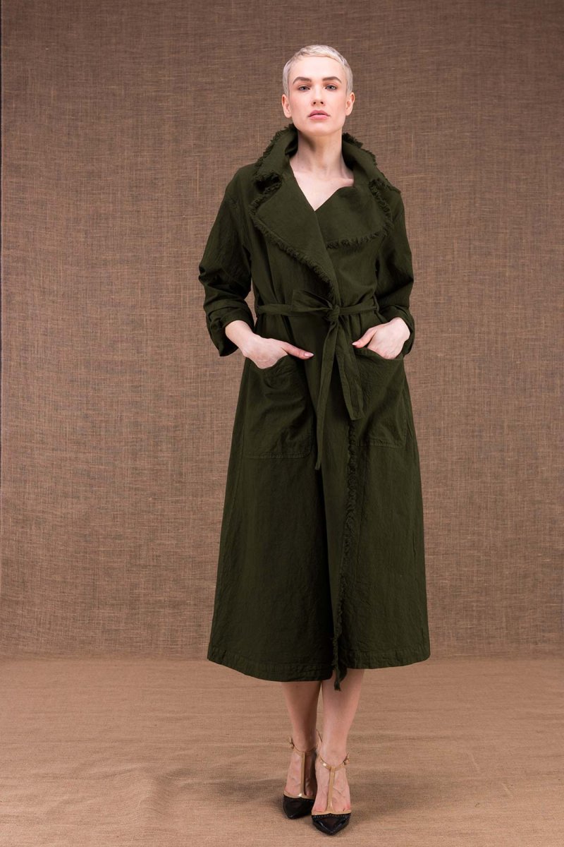 Khaki organic cotton trench coat for women BOGART. A long coat to absolutely have at home!