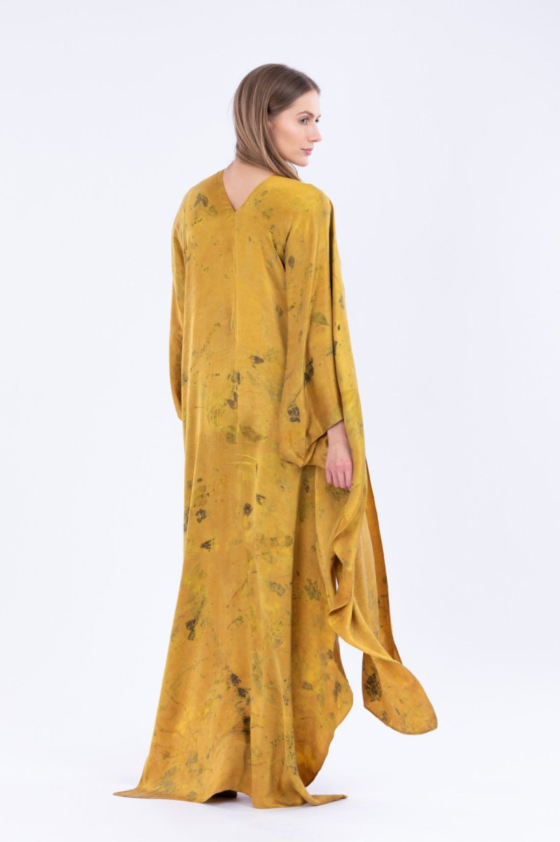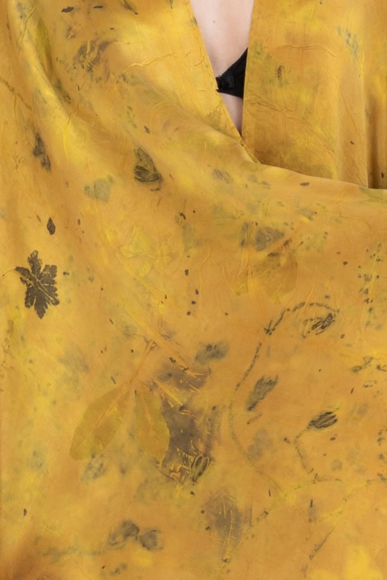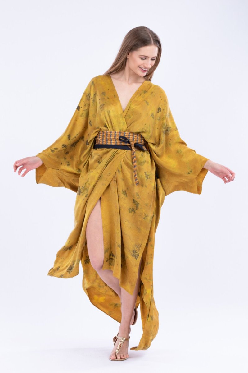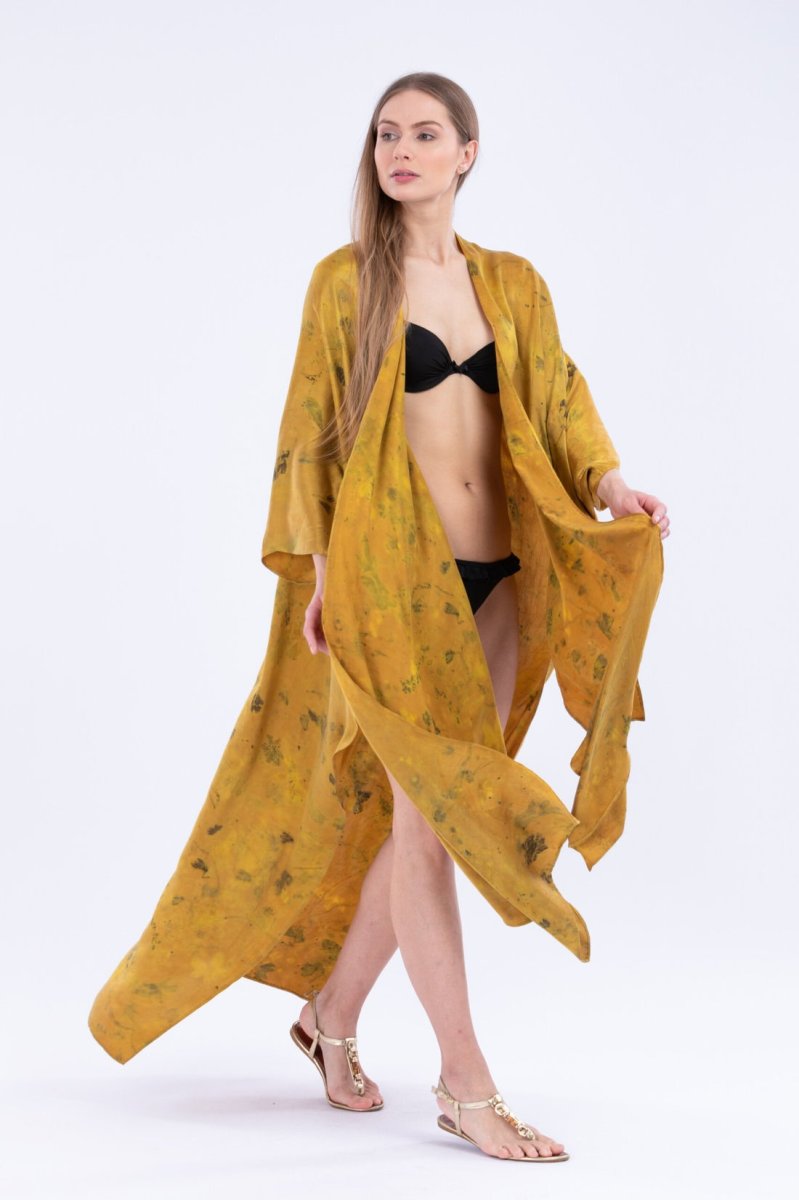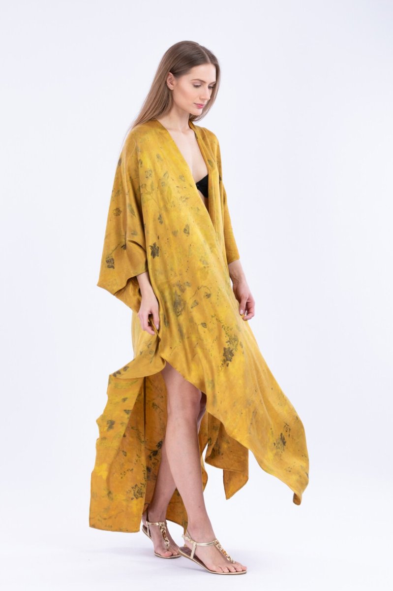 Kimono jaune en soie imprimée THÈBES. Virevoltant et papillonnant avec ses eco-print fait main.