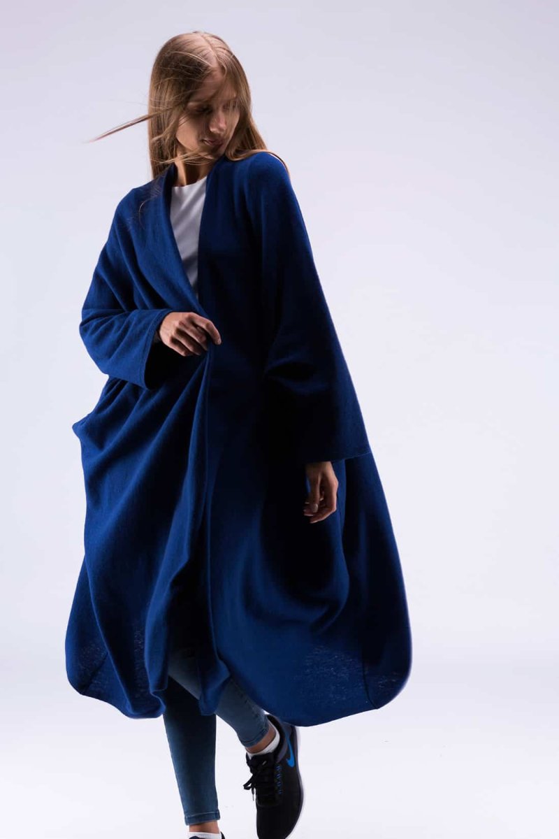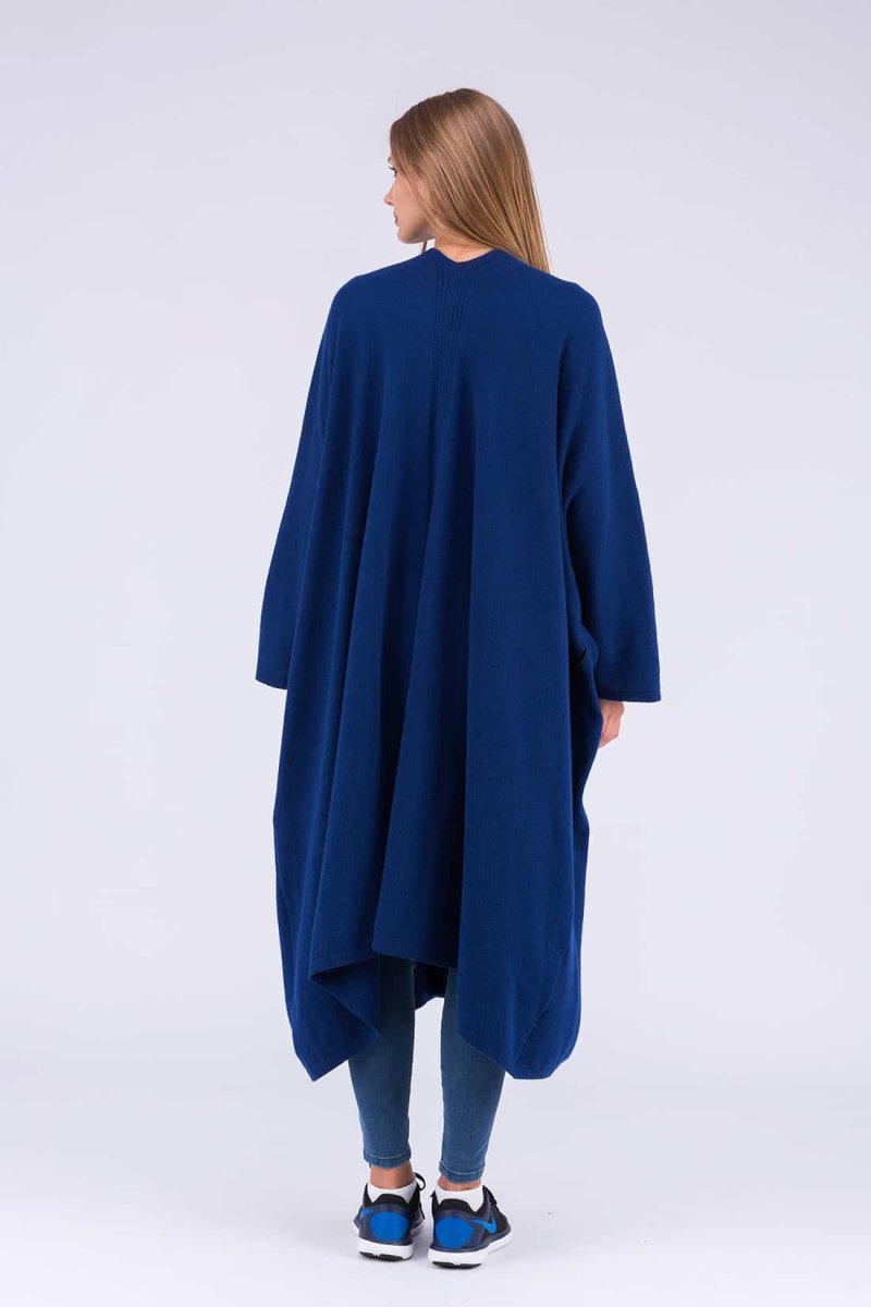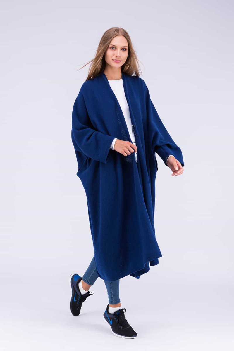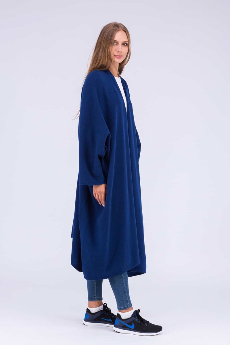 Manteau kimono bleu marine large pour femme en laine MIMAS. Un manteau fin en maille style kimono.