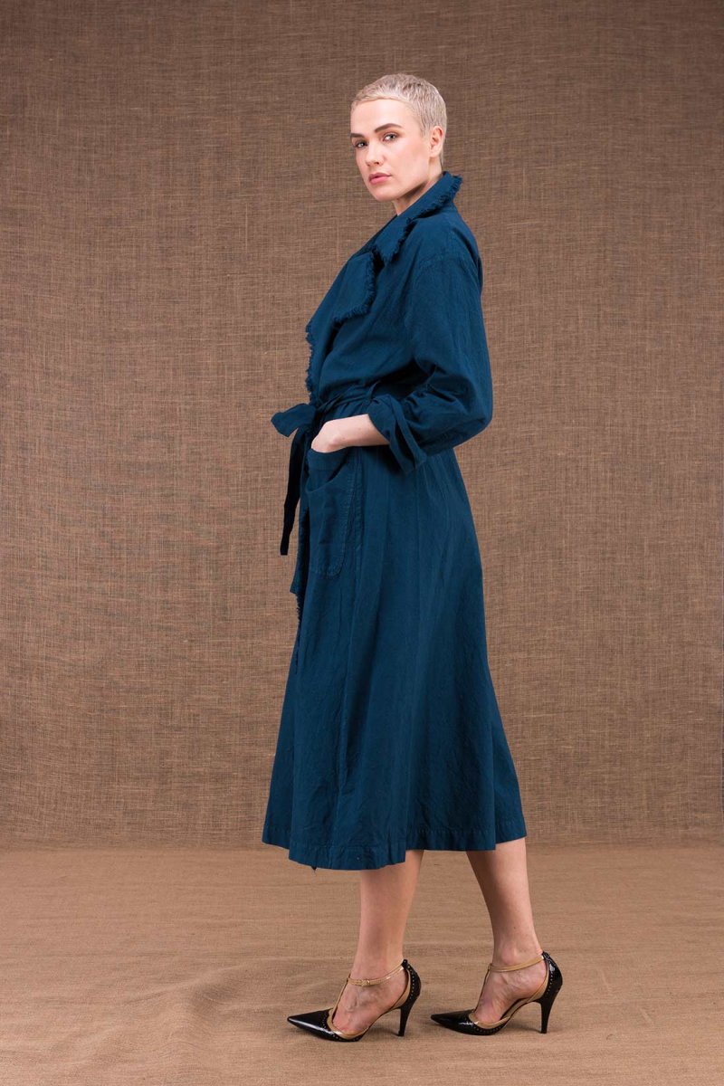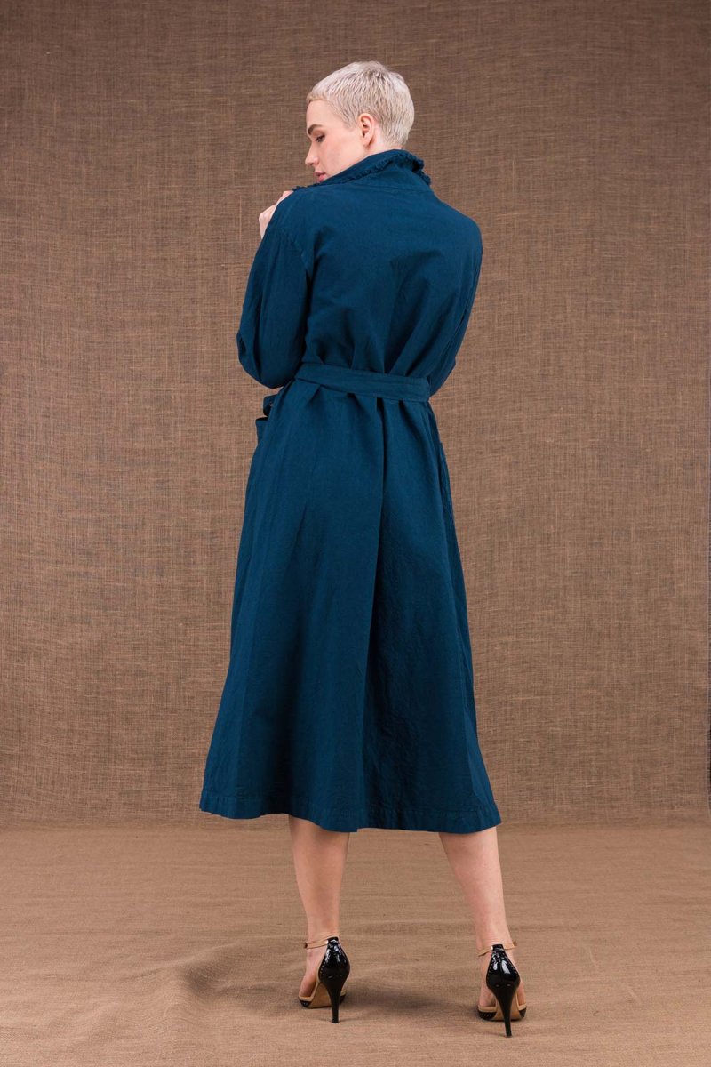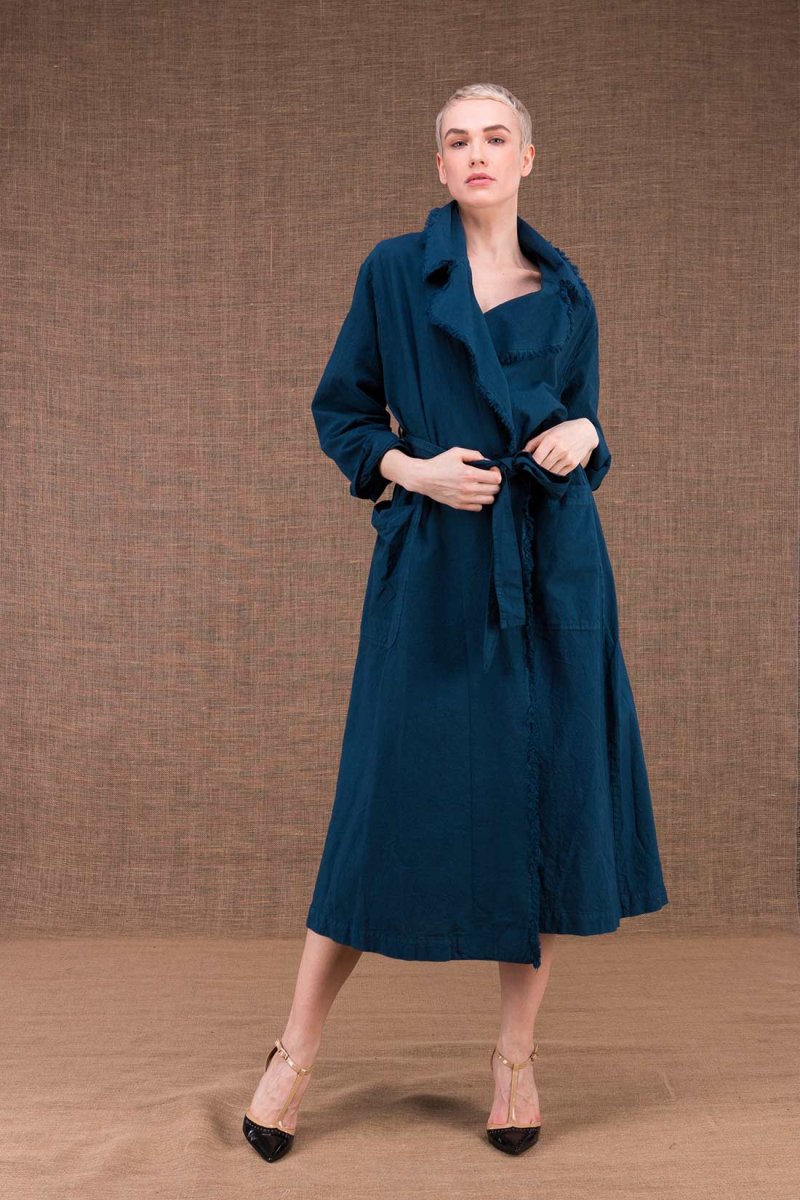 Manteau-trench bleu canard pour femme en coton bio BOGART. Un manteau long à absolument avoir chez soi !