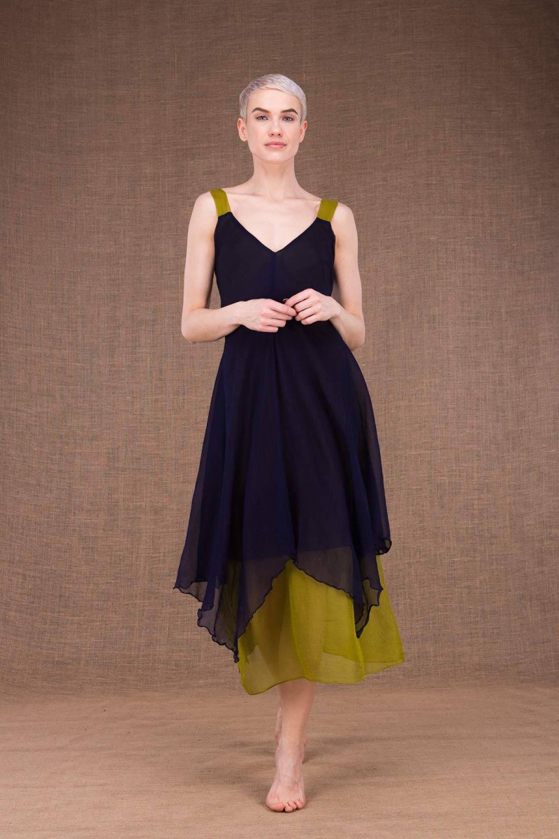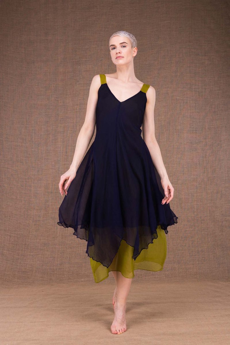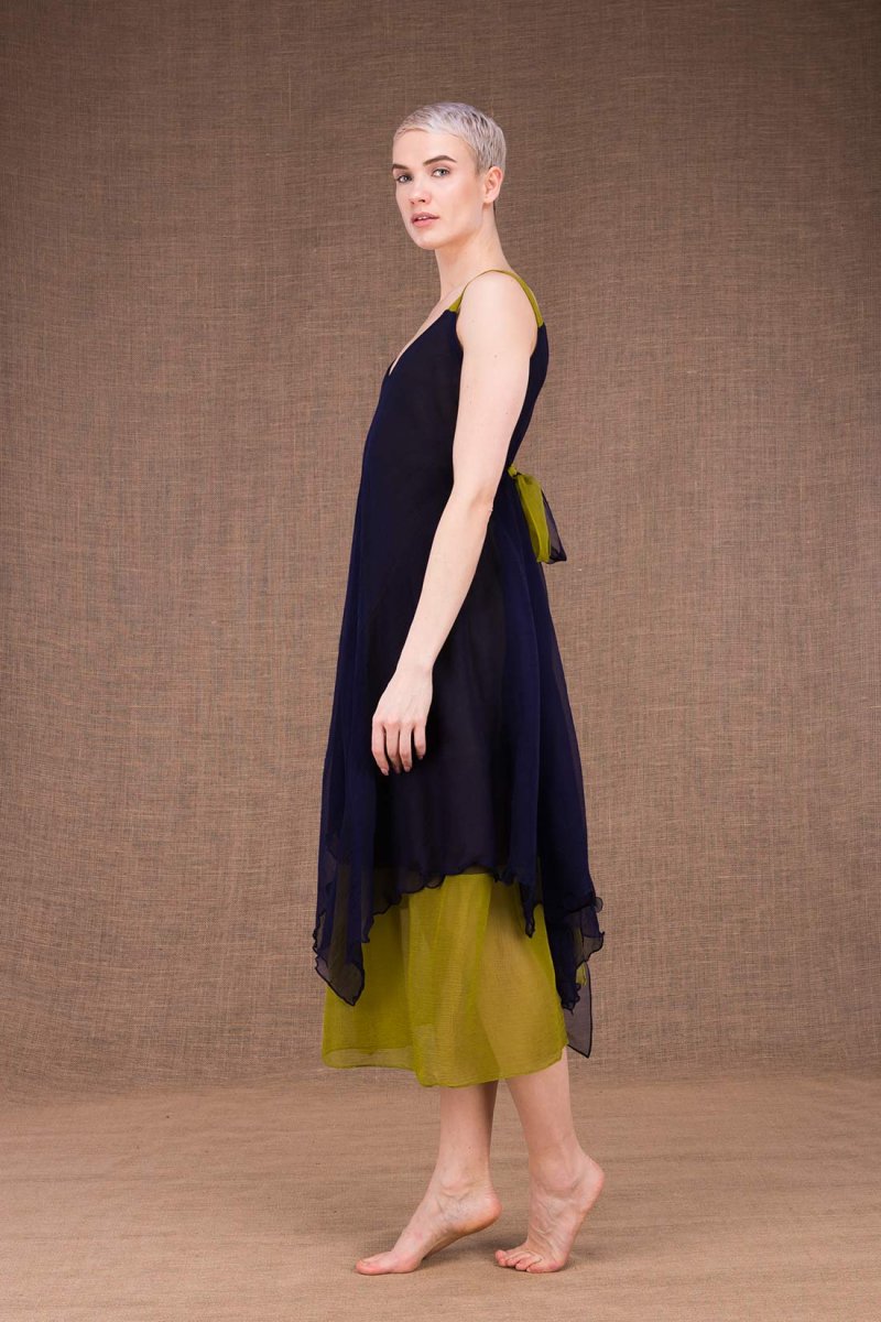 Navy blue green midi flared silk dress JADE. This bi-color midnight blue pistachio flared mid-length bell dress, fits your silhouette and sublimates it! Asymmetrical length, v-neckline, wide straps and small silk belt. It is ideal for weddings and other occasions! Composition: 100% silk, lining 100% organic cotton Washing: Dry clean