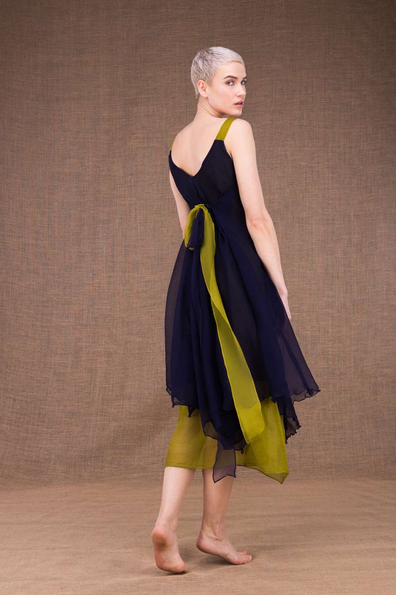 Navy blue green midi flared silk dress JADE. This bi-color midnight blue pistachio flared mid-length bell dress, fits your silhouette and sublimates it!