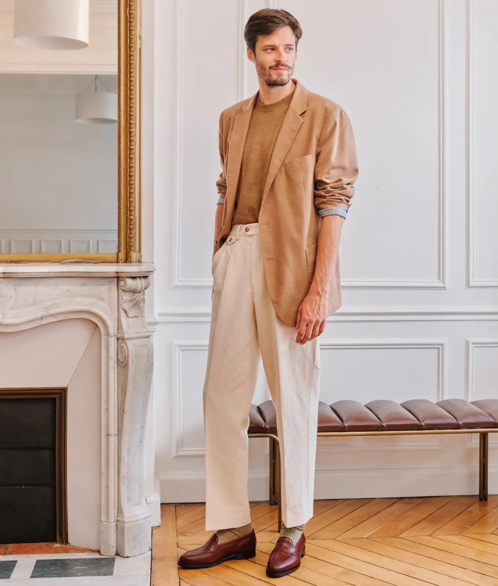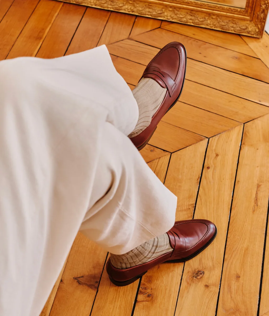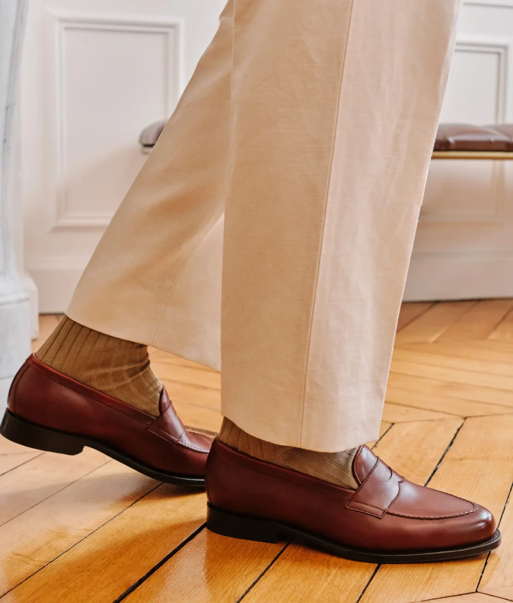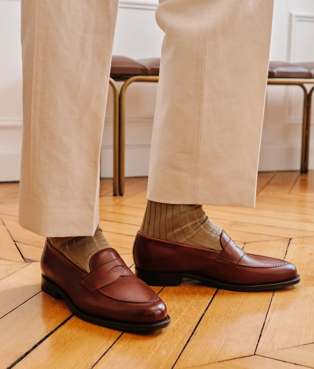 Mocassin à l’anglaise de part sa forme ronde et courte, le Nicodème se pare d’une couture pincé double aiguille, entièrement réalisée à la main. Entre savoir-faire et polyvalence, un soulier chic et élégant.