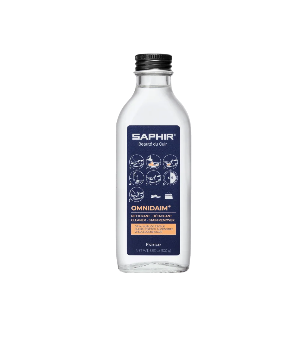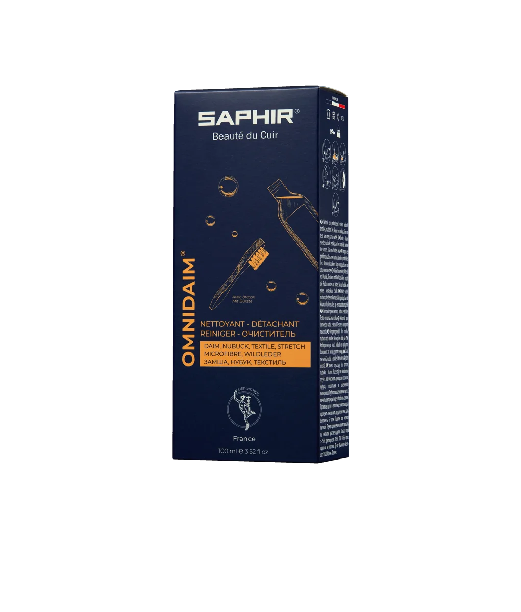 Nettoyant OmniDaim SAPHIR® pour le nettoyage en profondeur du veau velours. Son mélange exclusif de solvants et d’un nettoyant de base agissent sur tous types de taches et de salissures.