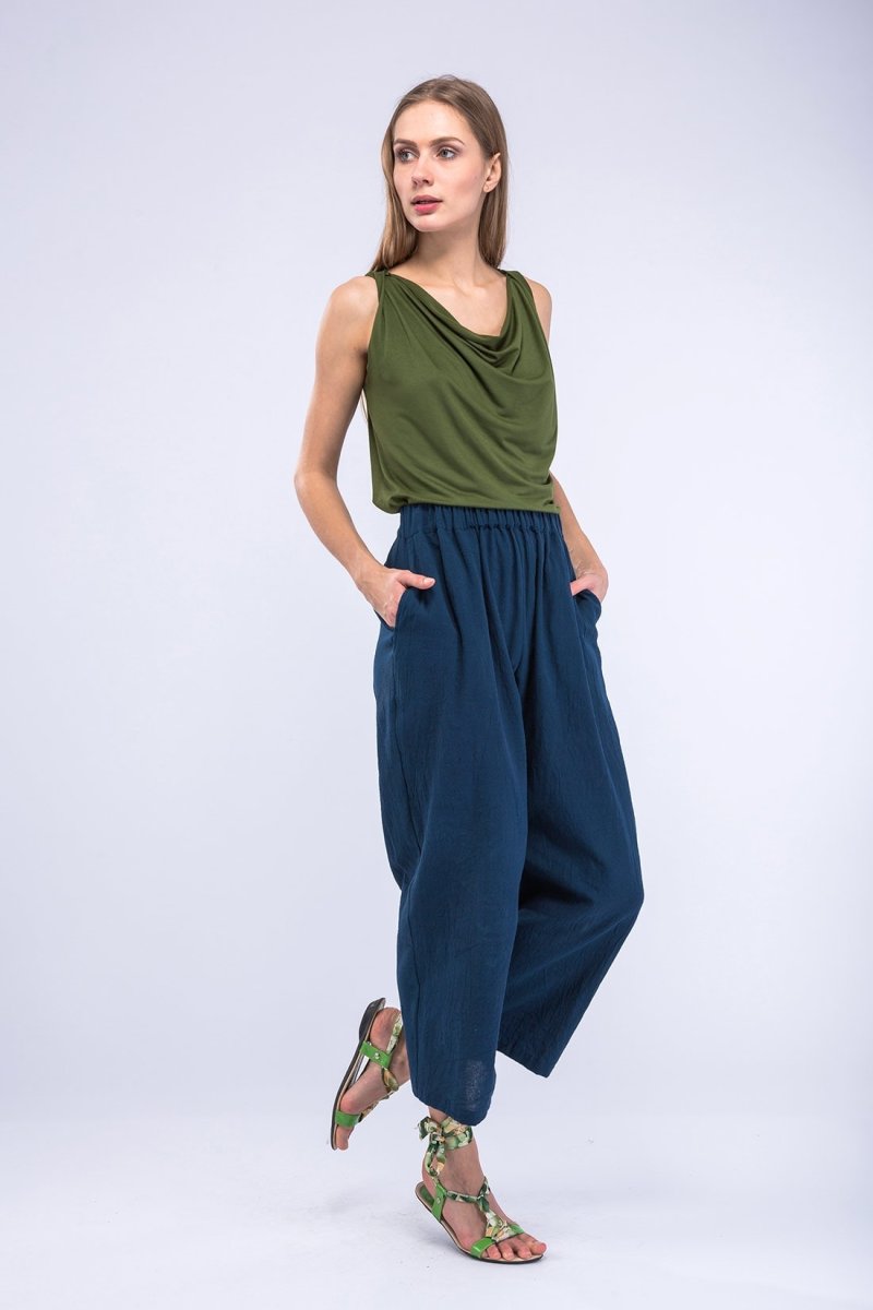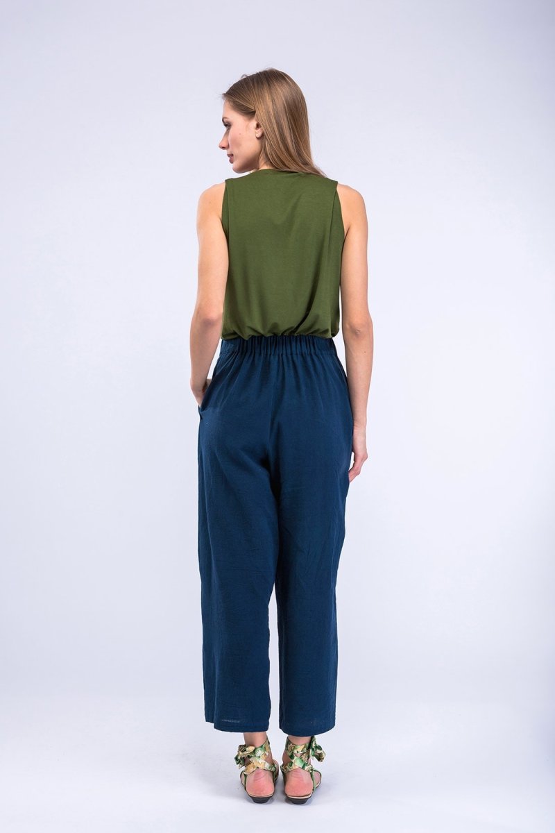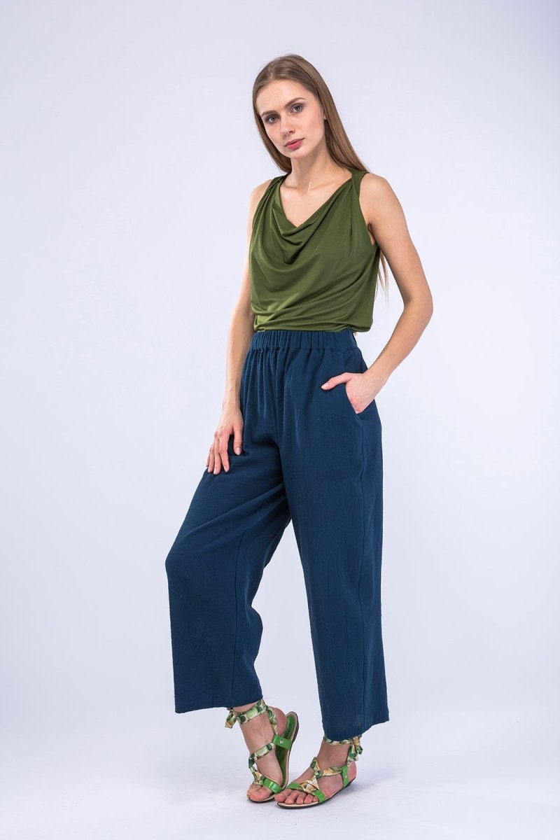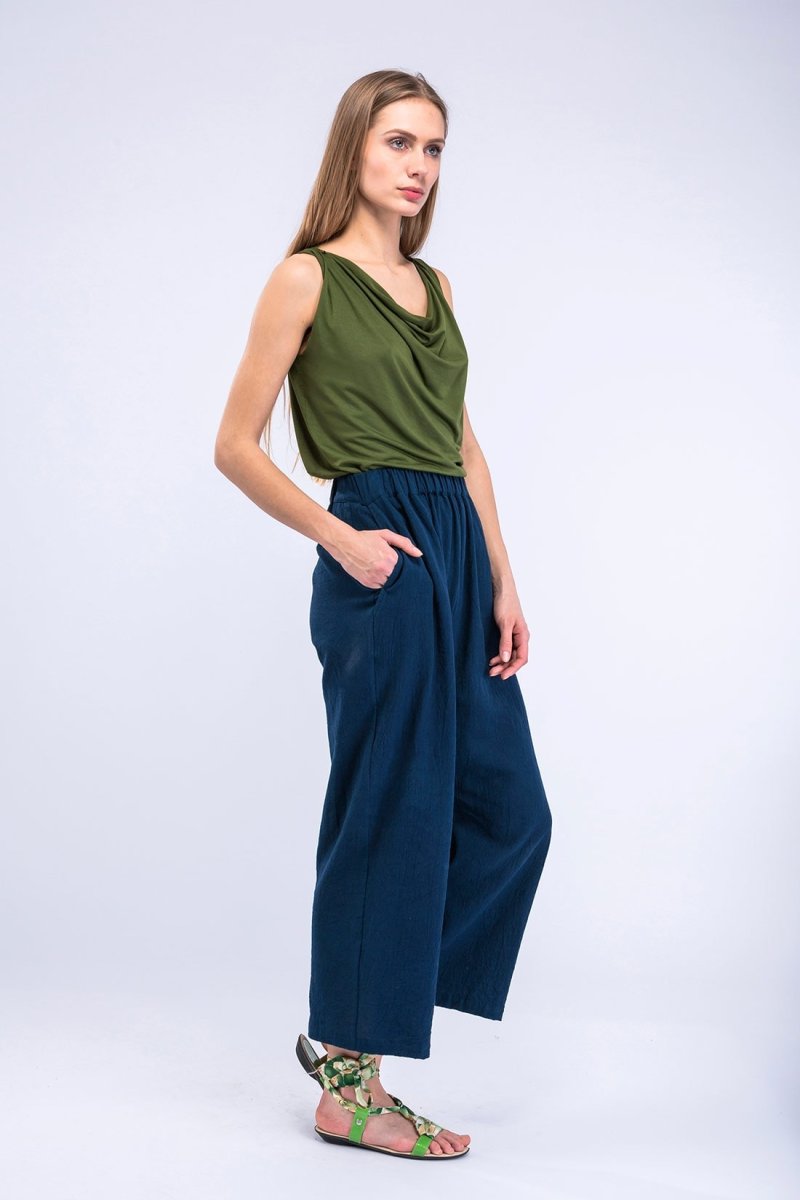 Pantalon bleu canard large en coton bio pour femme HALNY. Le confort avant tout.