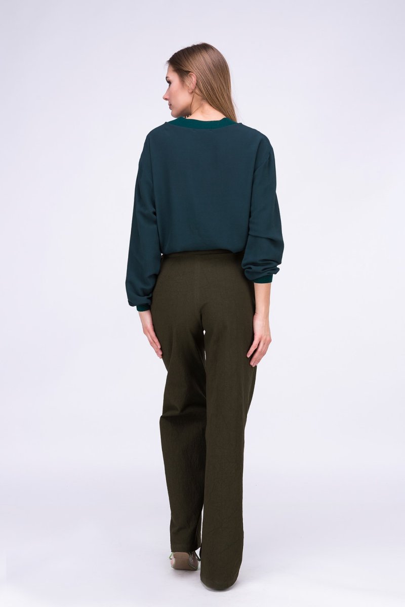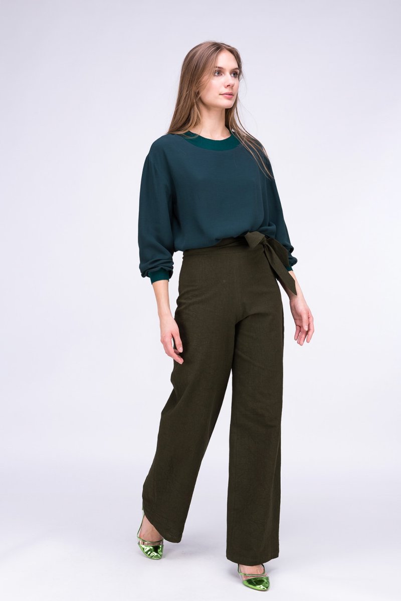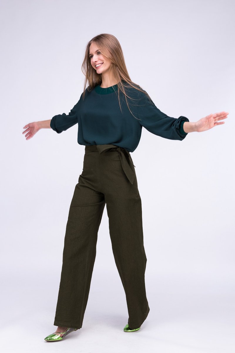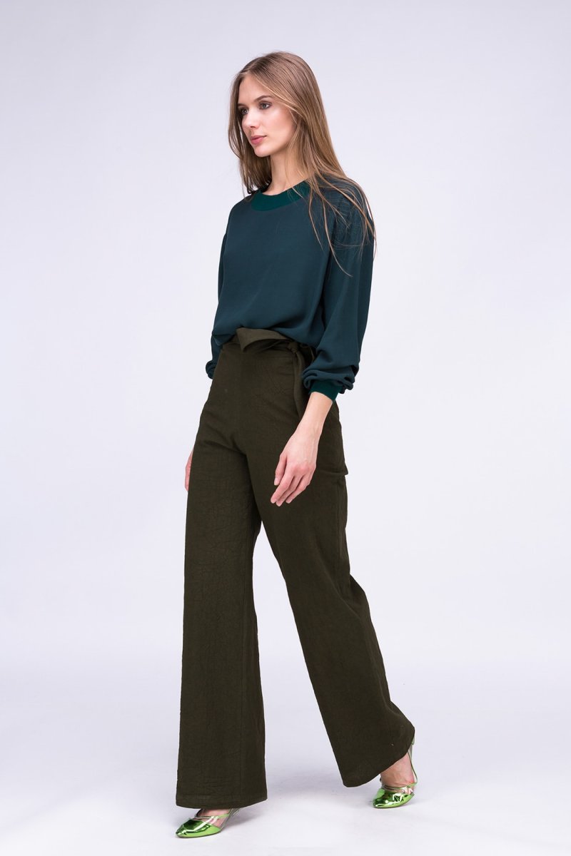 Pantalon kaki large en coton bio pour femme ATRIA. Confort et élégance. Ce pantalon large et fluide, en coton froissé, avec la taille marquée par une ceinture de la même matière, que vous pourrez nouer à votre guise. Composition : 100% coton Lavage : Machine 30° séparément Porté avec le top SIRIUS
