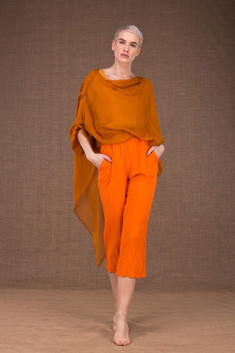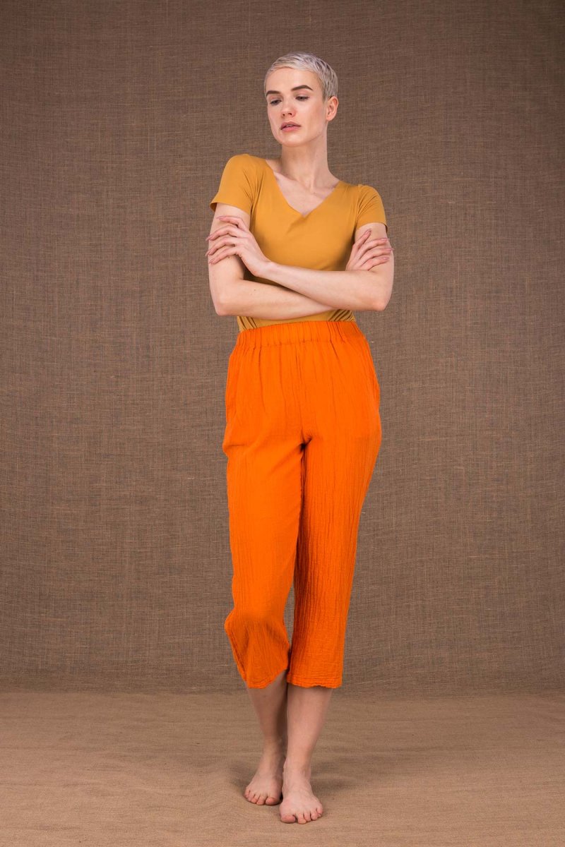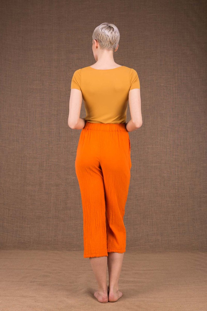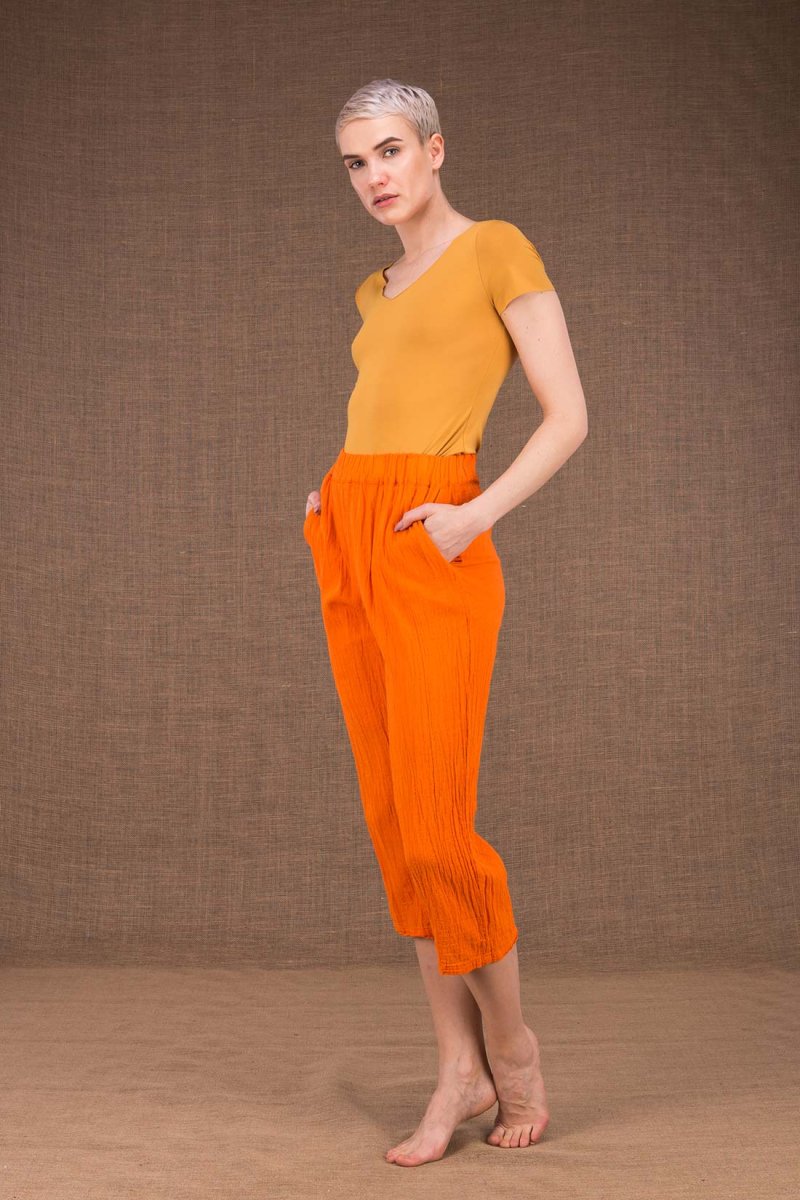 Pantalon orange en coton bio pour femme WIATR. Le confort avant tout. Les mains dans les poches, vous n’allez plus quitter ce pantalon souple en coton froissé, tombant au-dessus des chevilles et garni d’une large ceinture élastique. COMPOSITION : 100% coton LAVAGE : Machine froid séparément