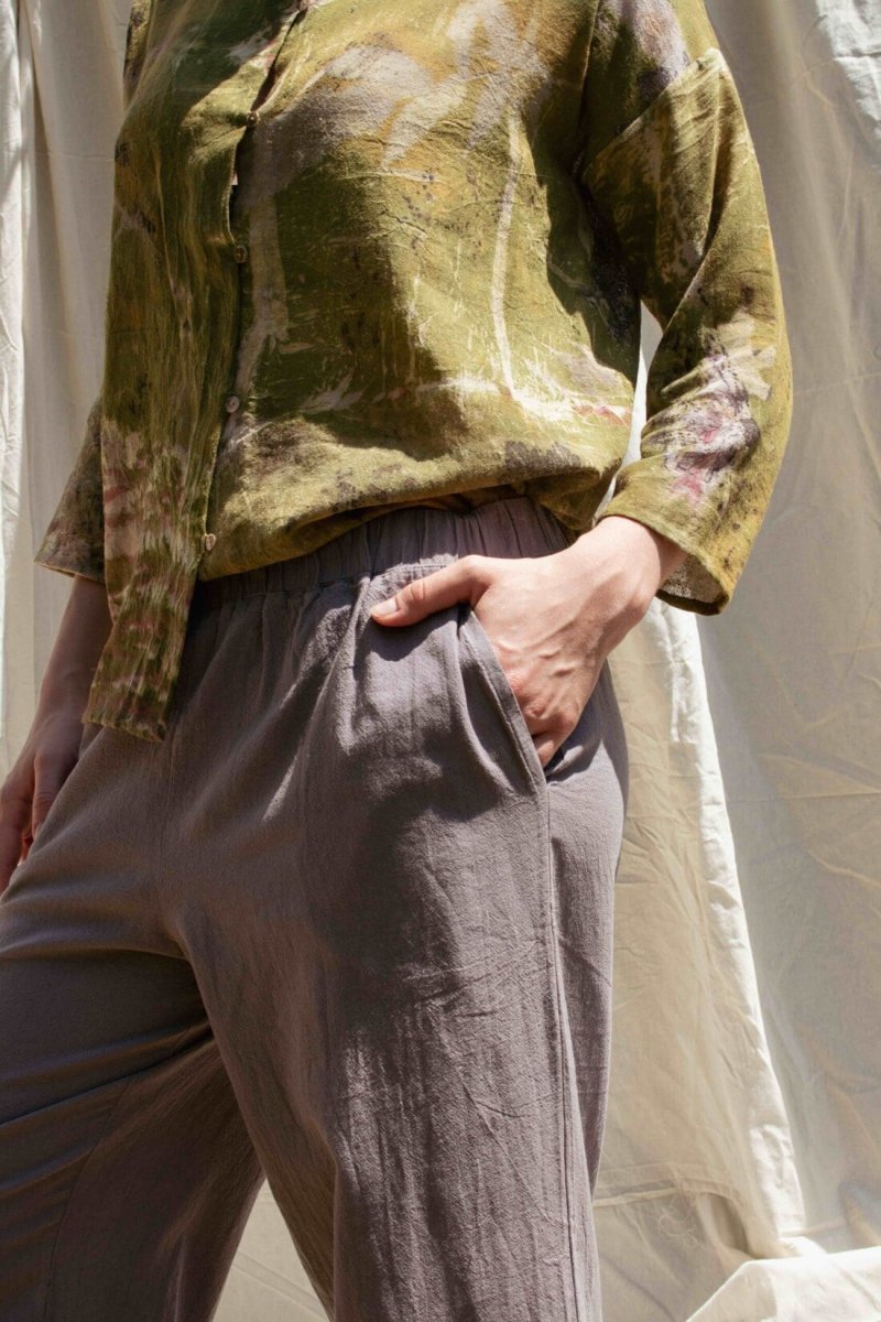 Pantalon taupe large en coton bio pour femme HALNY. Confectionné en coton biologique doux et respirant, le pantalon HALNY séduit par sa coupe ample et son confort naturel. Léger mais structuré, il se porte toute l’année — seul, avec un t-shirt en été ou superposé en hiver.