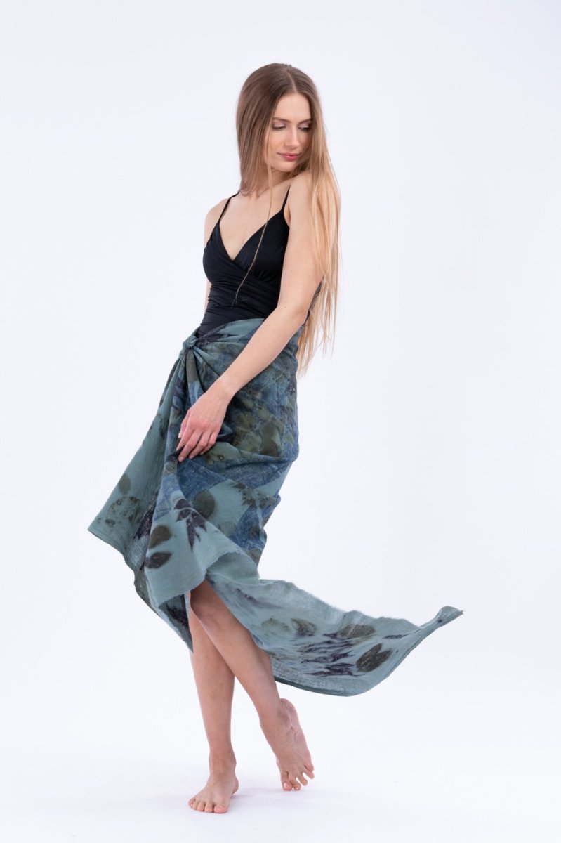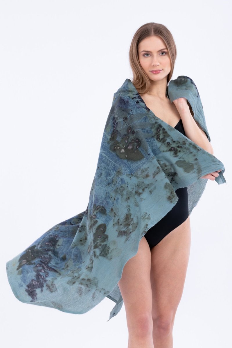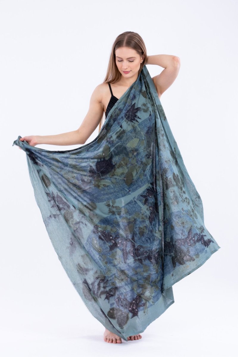 Carré de coton bio aux teintes marines et végétales imprimé à la main avec la technique eco-print. Se porte facilement l’été en robe de plage et toute l’année en châle original.