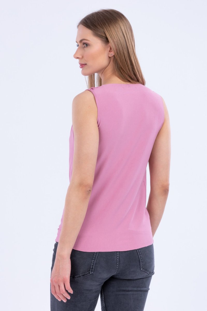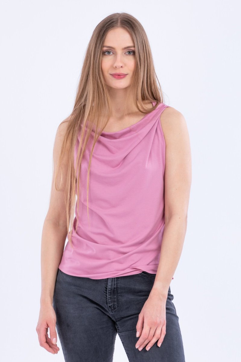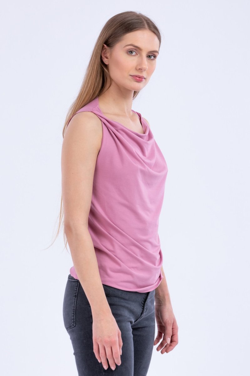 Pink draped cowl neck viscose jersey top for women PARISA. Flowing, in an easy to wear viscose mesh.