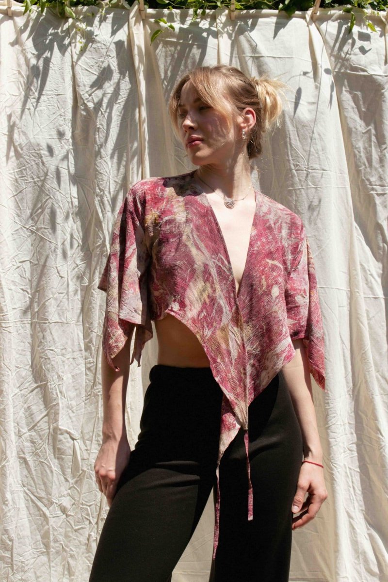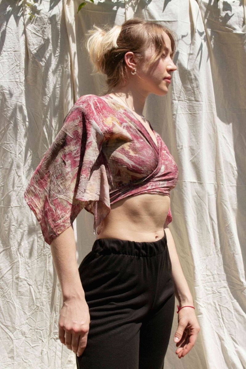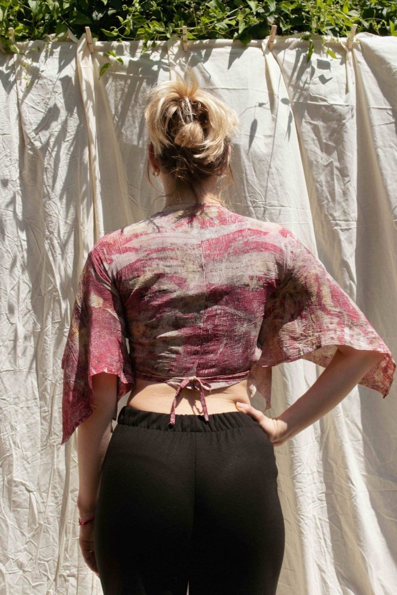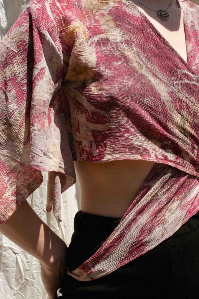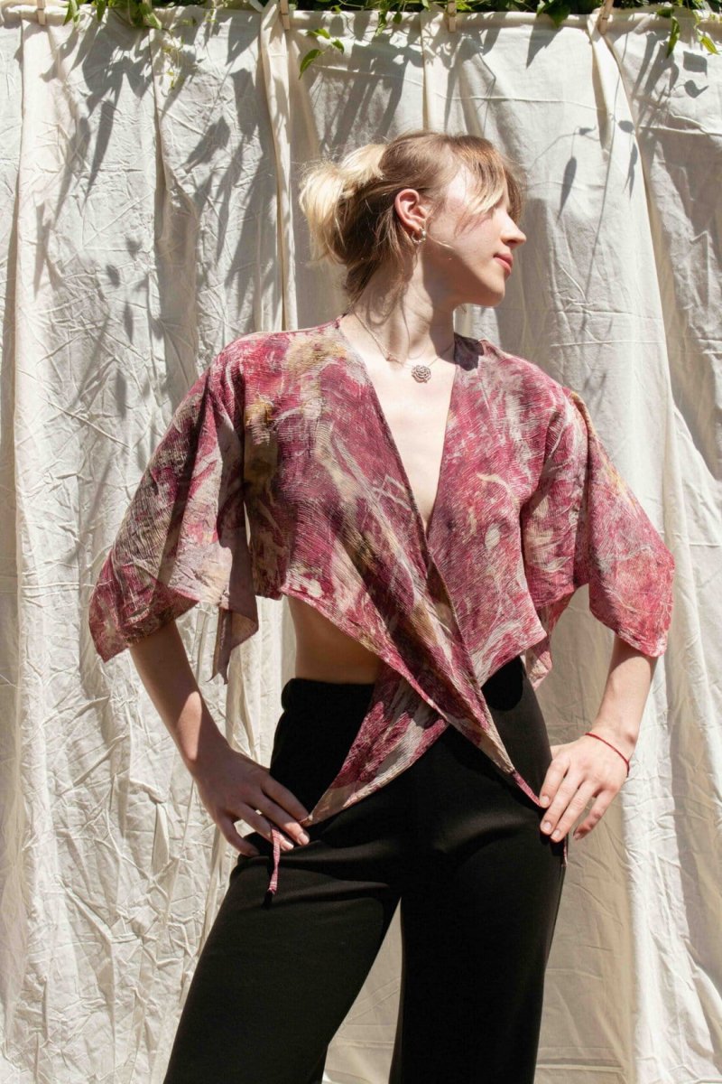 Pink hand-printed wrap-around jacket CHLOE. Extremely fluid thanks to its crinkled silk crepe. It can be worn open or closed, perfect with long dresses and wide pants. Its great originality lies in the wide butterfly sleeves. Please note: Each piece is unique. The eco-print you receive will not necessarily be the same as the one […]