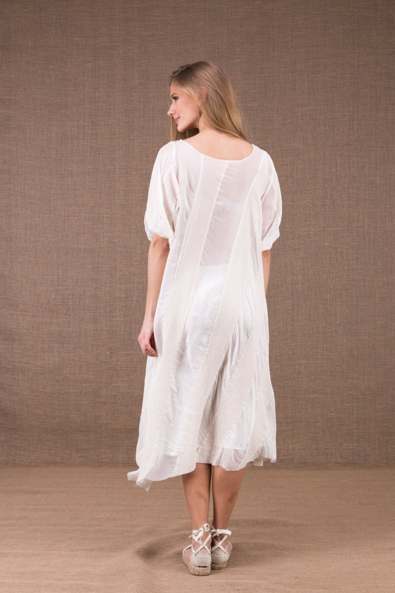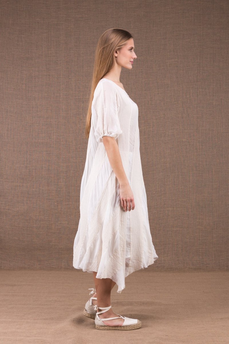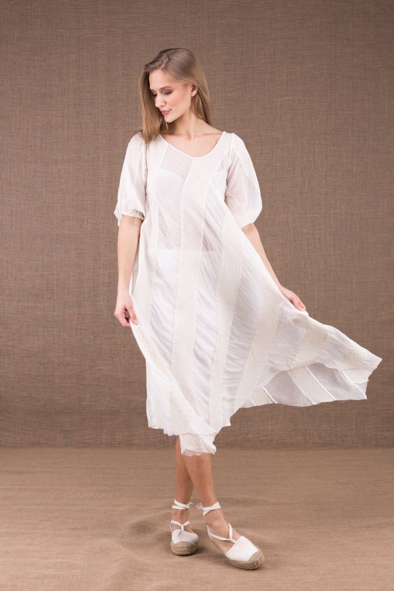 Robe blanche mi-longue évasée en soie et coton bio CATALPA. Jouez les rayures et l’asymétrie avec cette robe légère, en gaze de coton bio et mousseline de soie.