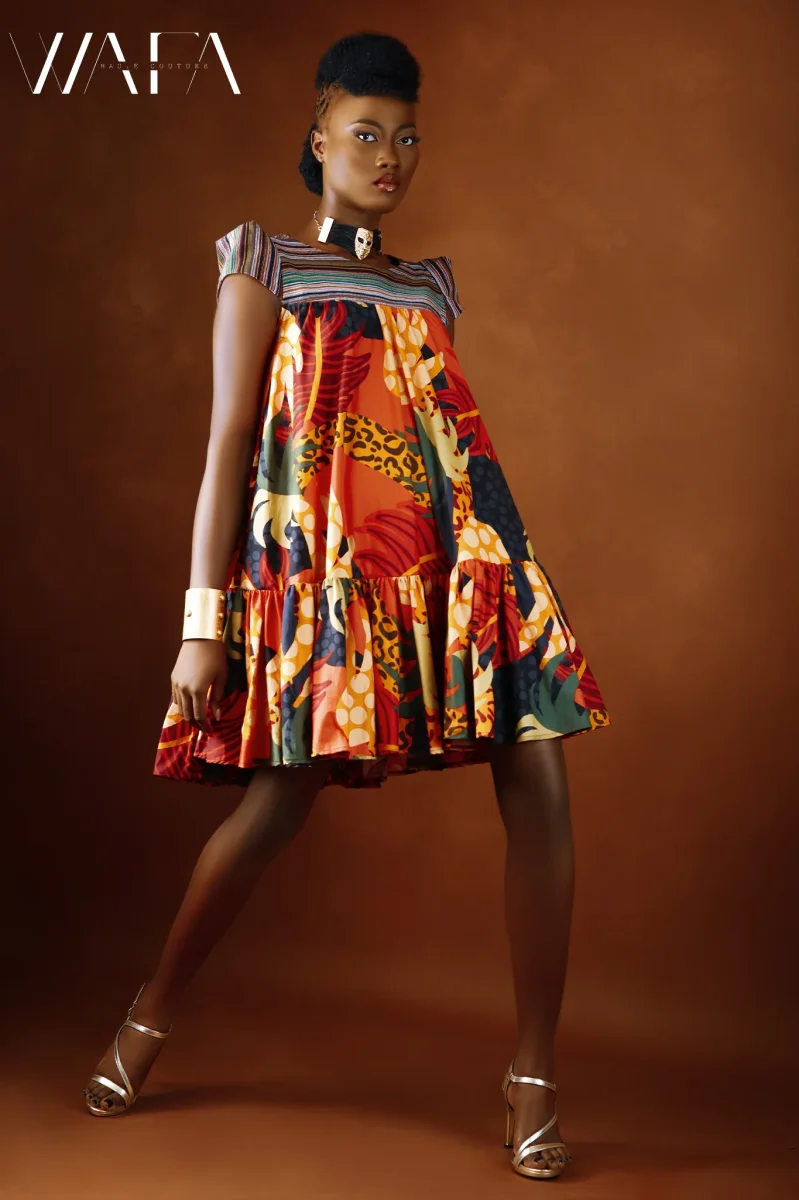 Vous pouvez trouver des robes en tissu fleuri – pagne tissé chez Wafa créateur de mode africains.