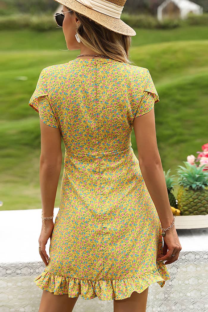 Si tu recherches une tenue féminine et légère pour un mariage, la coupe courte portefeuille de cette petite robe jaune est parfaite. En plus de mettre en valeur ta silhouette avec féminité, elle allonge ta silhouette en mettant en avant tes jambes.