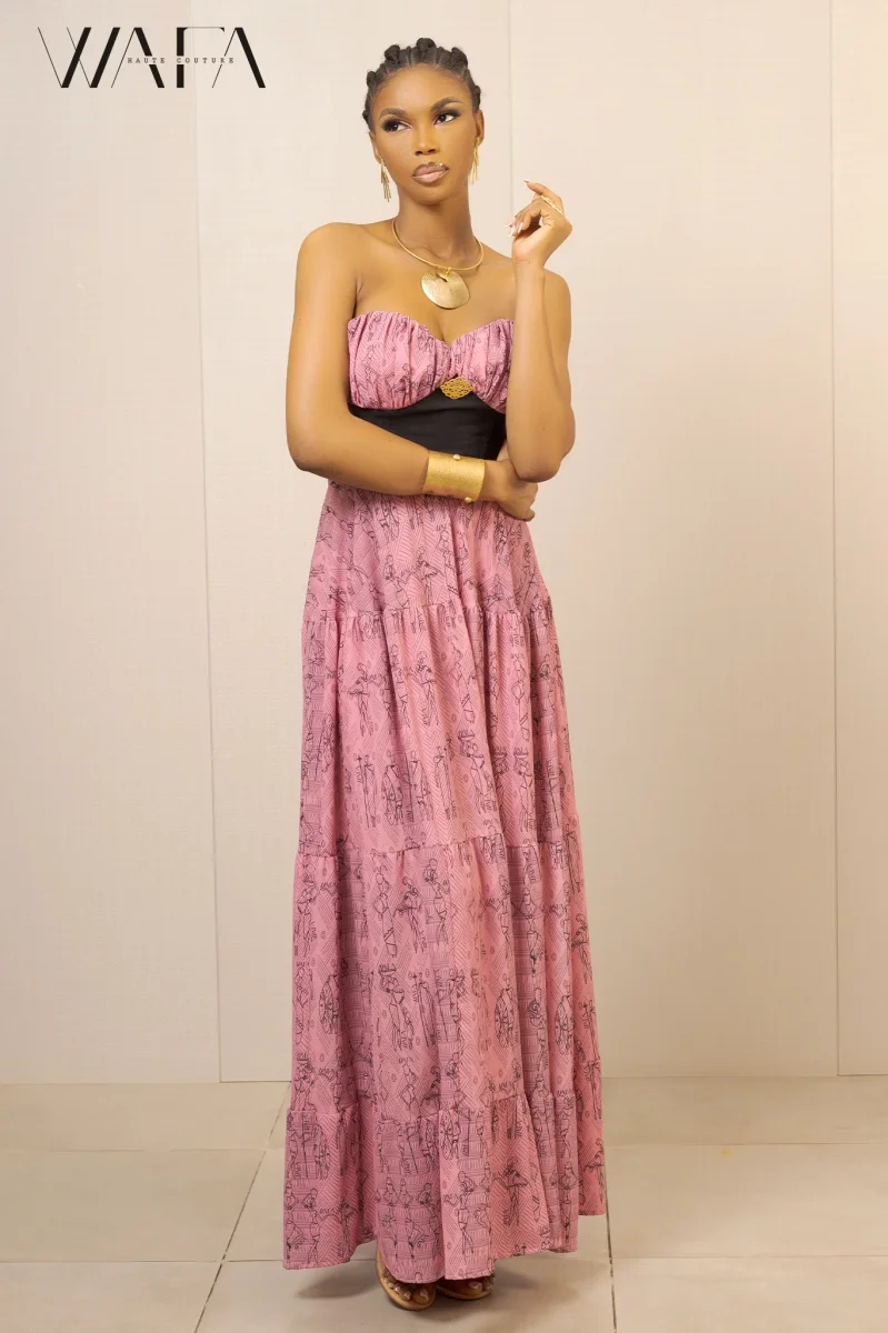 Robe longue en tissu imprimé Wafa avec tissu noir à la taille