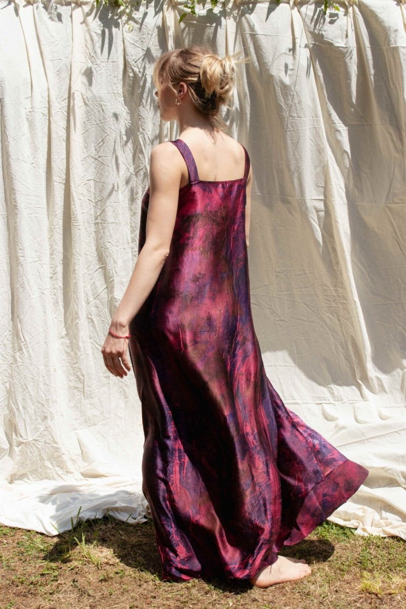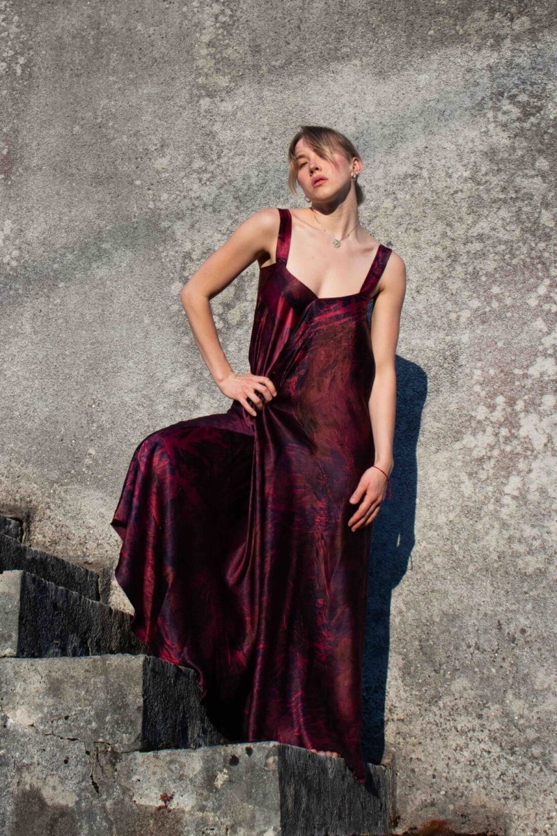 Robe longue evasée en satin de soie imprimée à la main GAIA