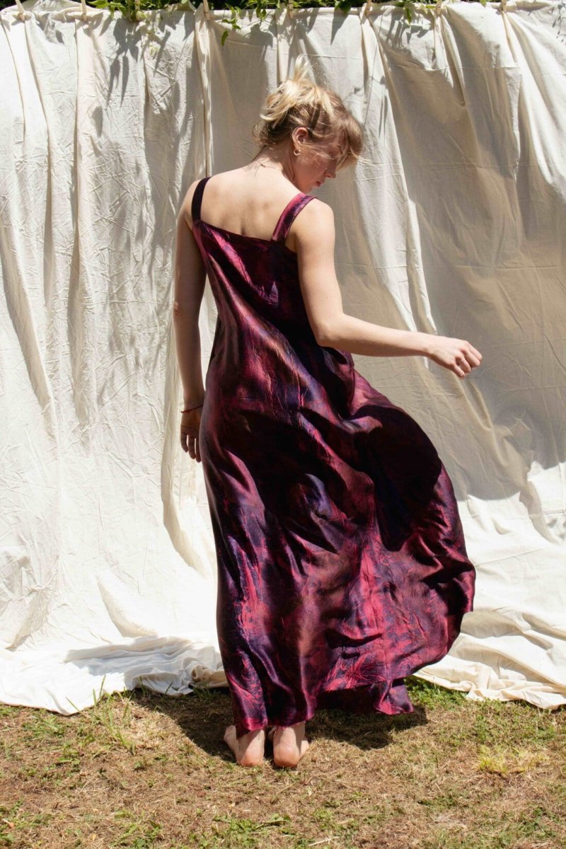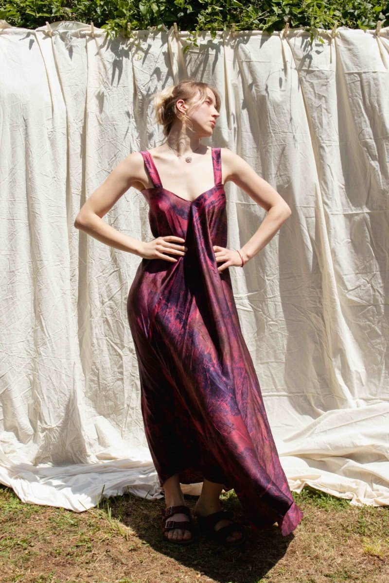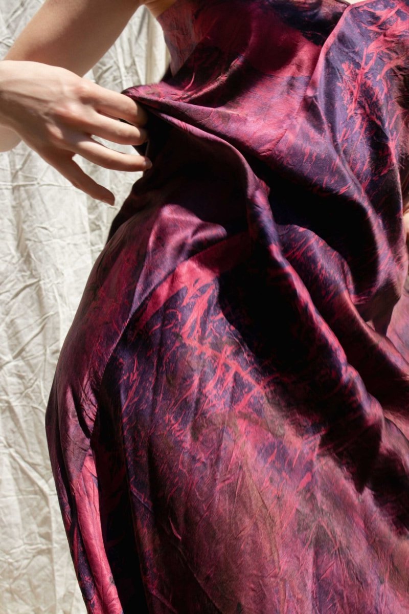 Robe longue evasée en stain de soie imprimée à la main GAIA. Les milles et une nuits avec un imprimé eco-print fait à la main.