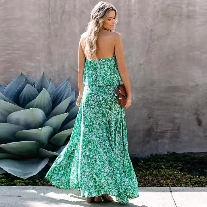 Caractéristiques de la Robe Longue Verte Bustier Sans Manches À Fleurs