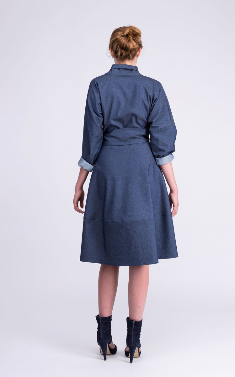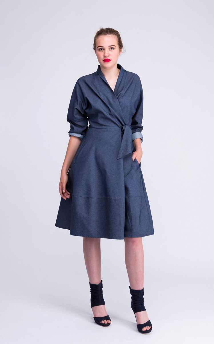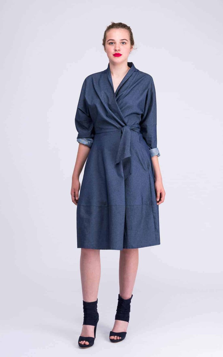 Robe-manteau denim cache-cœur, à col châle, soulignée à la taille par une longue ceinture, que l’on peut nouer à son gré. Peut se porter cintrée, en robe, ou bien ouverte, façon manteau.