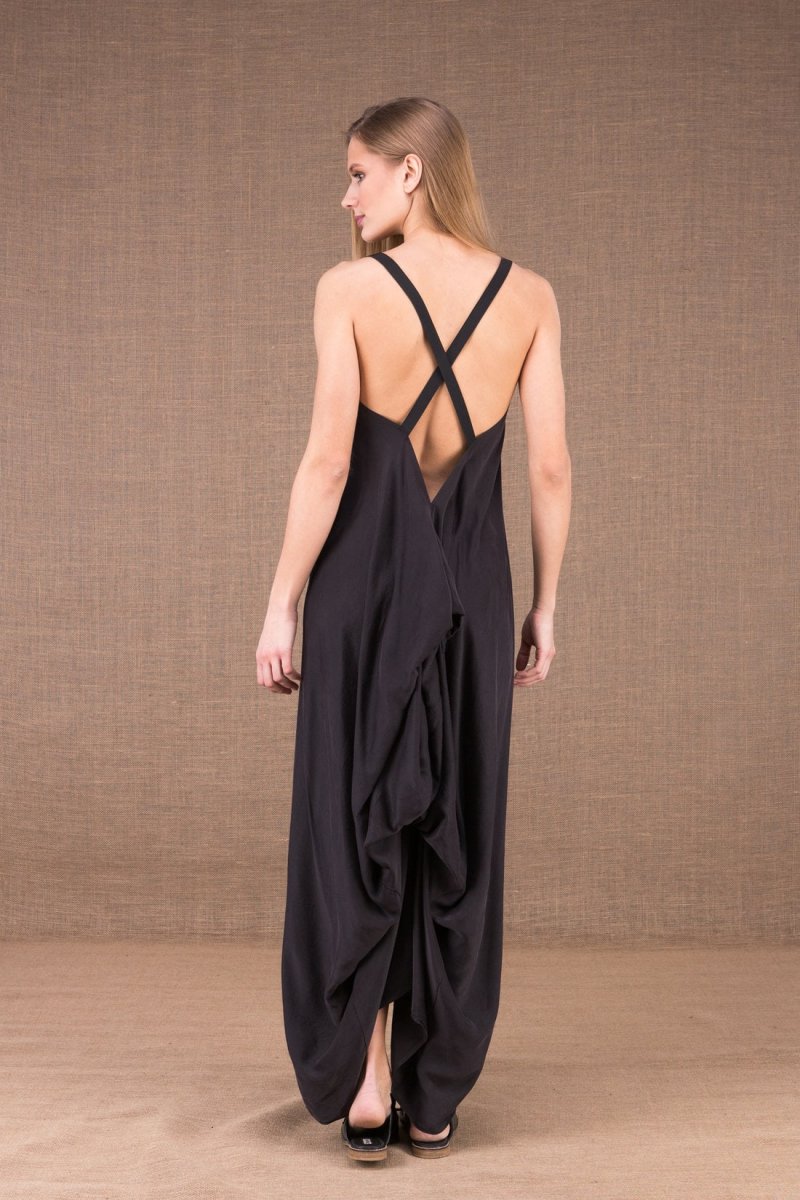 Robe noire longue dos nu en satin de soie IZA. Soyez la plus rayonnante dans cette superbe robe longue dos nu en satin de soie.