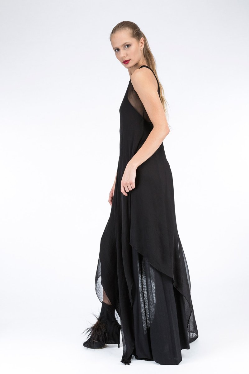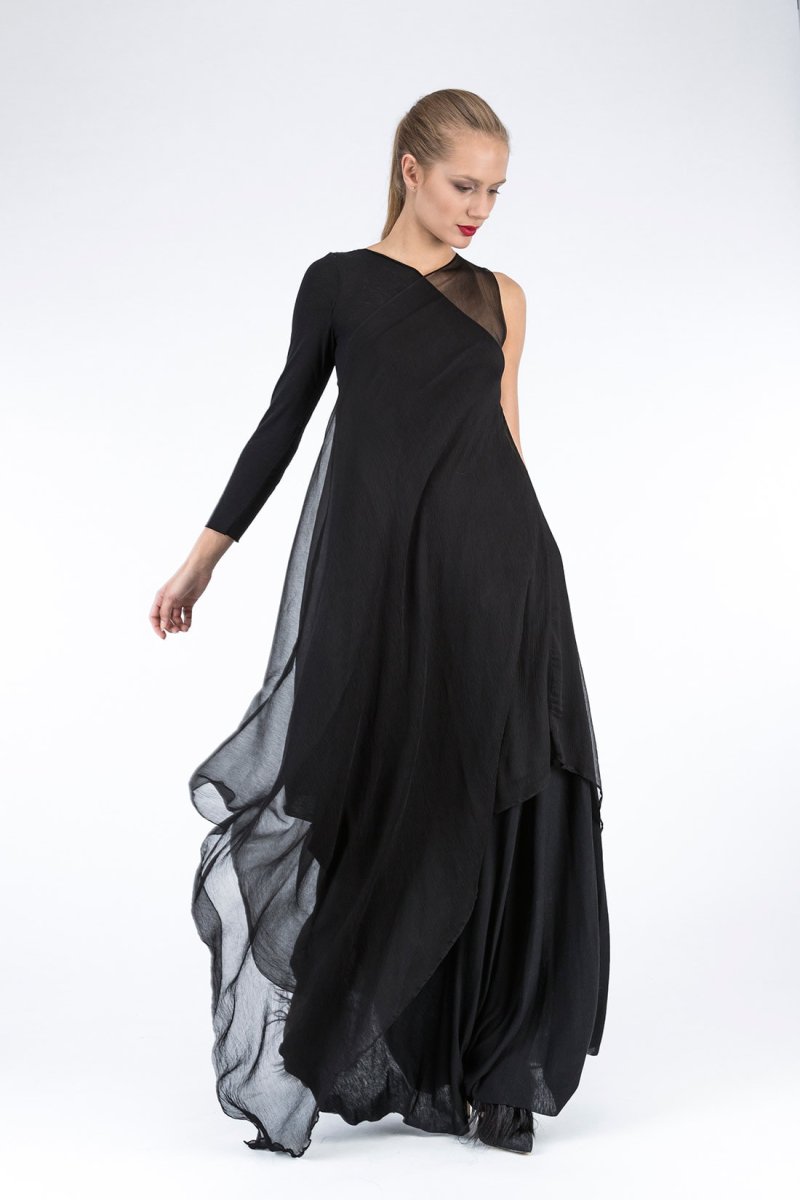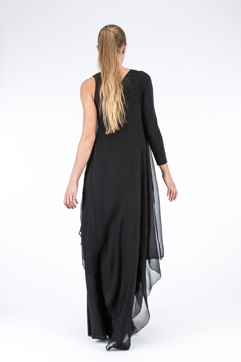Robe longue uni-manche, formée de deux pans superposés. L’un en mousseline de soie gaufrée pour une élégance raffinée et l’autre en jersey de viscose pour le confort. Soulignant le buste, puis s’évasant avec légèreté, cette robe longue vous accompagnera toutes les saisons dans vos soirées habillées.
